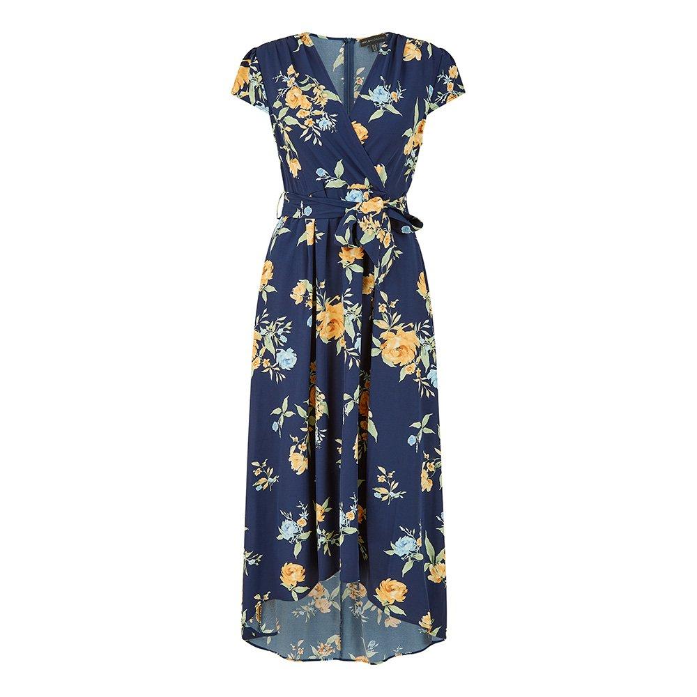 Women's Navy Floral Print Dipped Hem Wrap Dress