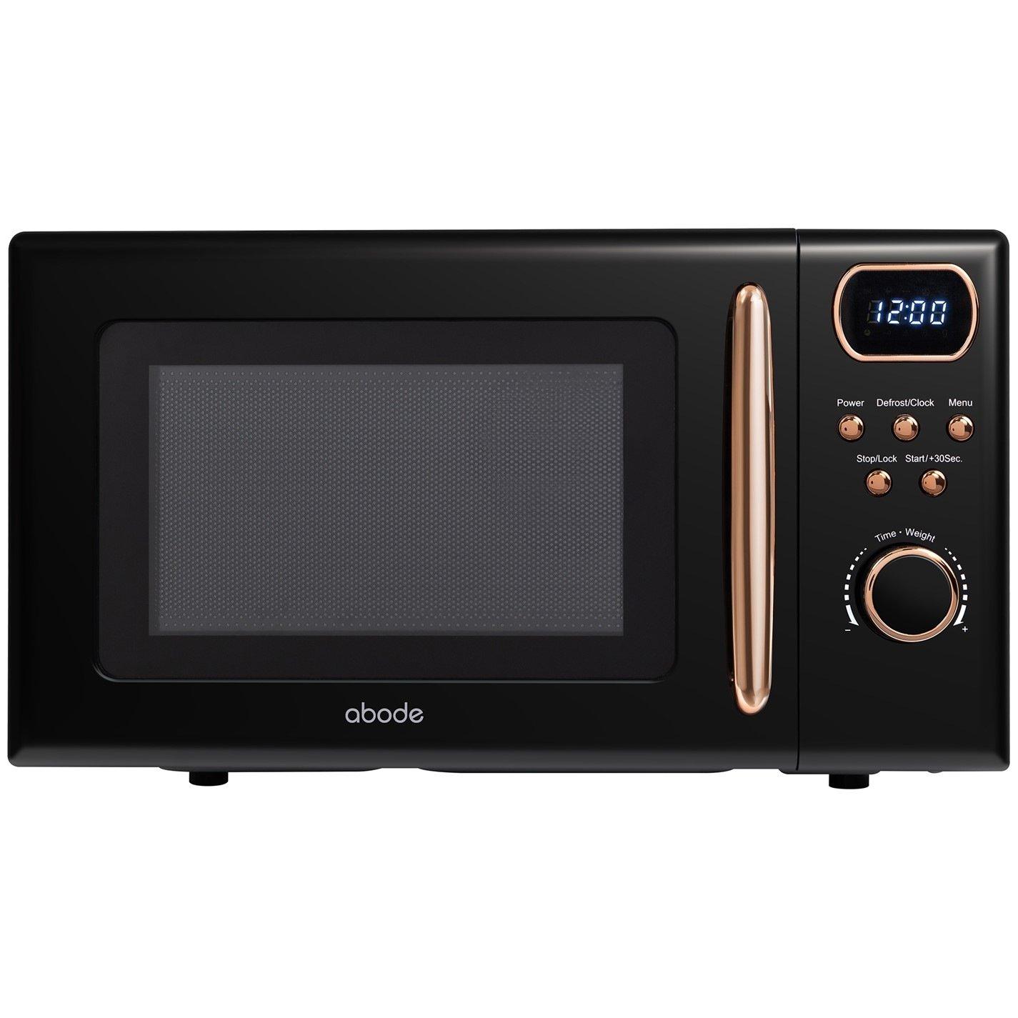 Looking to upgrade your kitchen setup? Bring some fun to your countertops with this Abode digital microwave. Packed with handy features and wrapped up in a stunning black design with rose gold accents, this is the perfect everyday appliance for putting a smile on your face. With a 20L capacity and space to fit an 11” pizza, this microwave can heat up anything from family-sized meals to those sneaky midnight snacks (don’t worry, only we know about that). It’s getting hot in here with 800W of power and 5 power levels that you can change with the press of a button. From fresh ingredients to ready meals straight from the freezer, this microwave has you covered. The defrost function heats up food without leaving hot and cold spots on the first try. After a long day, let this microwave do the work for you! Choose from one of the 8 auto-cook menus, then kick back and wait for the ding from the 60-minute timer. Buy with confidence! This microwave comes with a 1-year guarantee, so you know that if anything should go wrong, we’ll be around to help you out. No worries here—just delicious meals.