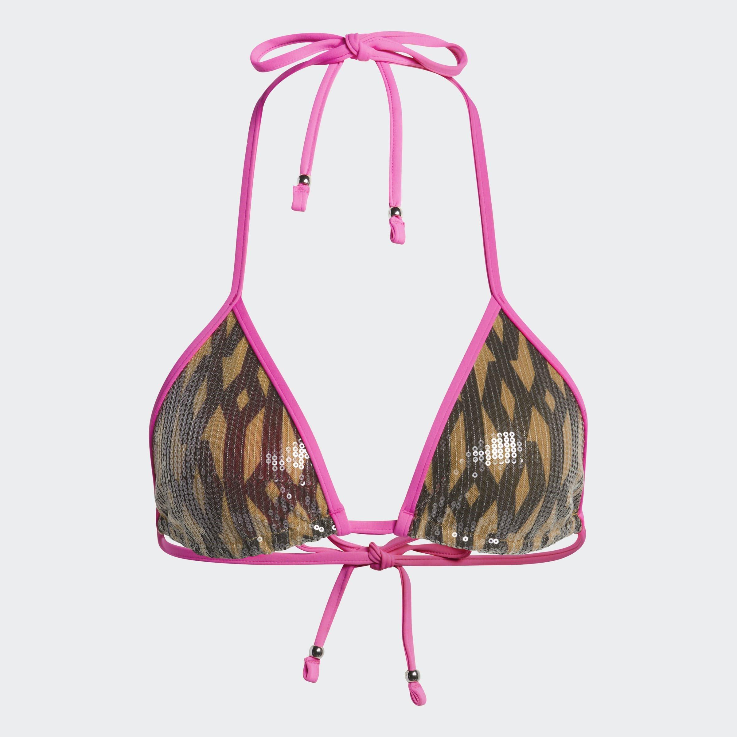 This IVY PARK x adidas bikini top makes the most of versatility. On one side, shimmering sequins overlay the IVY PARK monogram with a pop of pink trim. On the other, a playful polka-dot print stretches over super-soft fabric. The silver accents on the ties glint in sunlight, creating the perfect finish for a flashy summer look.