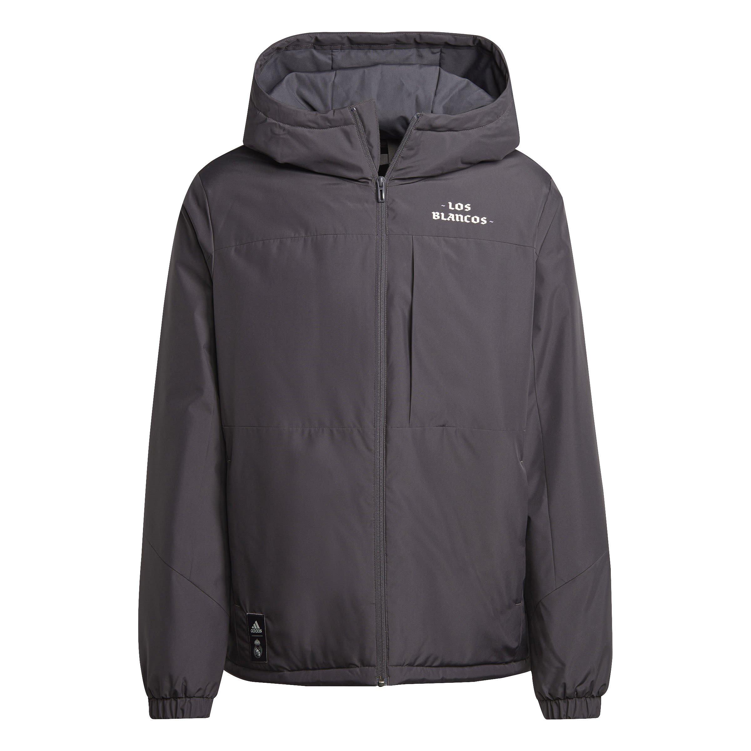 The Real Madrid Hooded Long Sleeve Jacket from adidas shows your allegiance to Los Blancos with the club's nickname on the chest and a bold Real Madrid graphic on the back. This athletic apparel features lightweight padding that keeps you warm all season, while zip pockets secure your essentials as you celebrate each goal in style during football matches.
