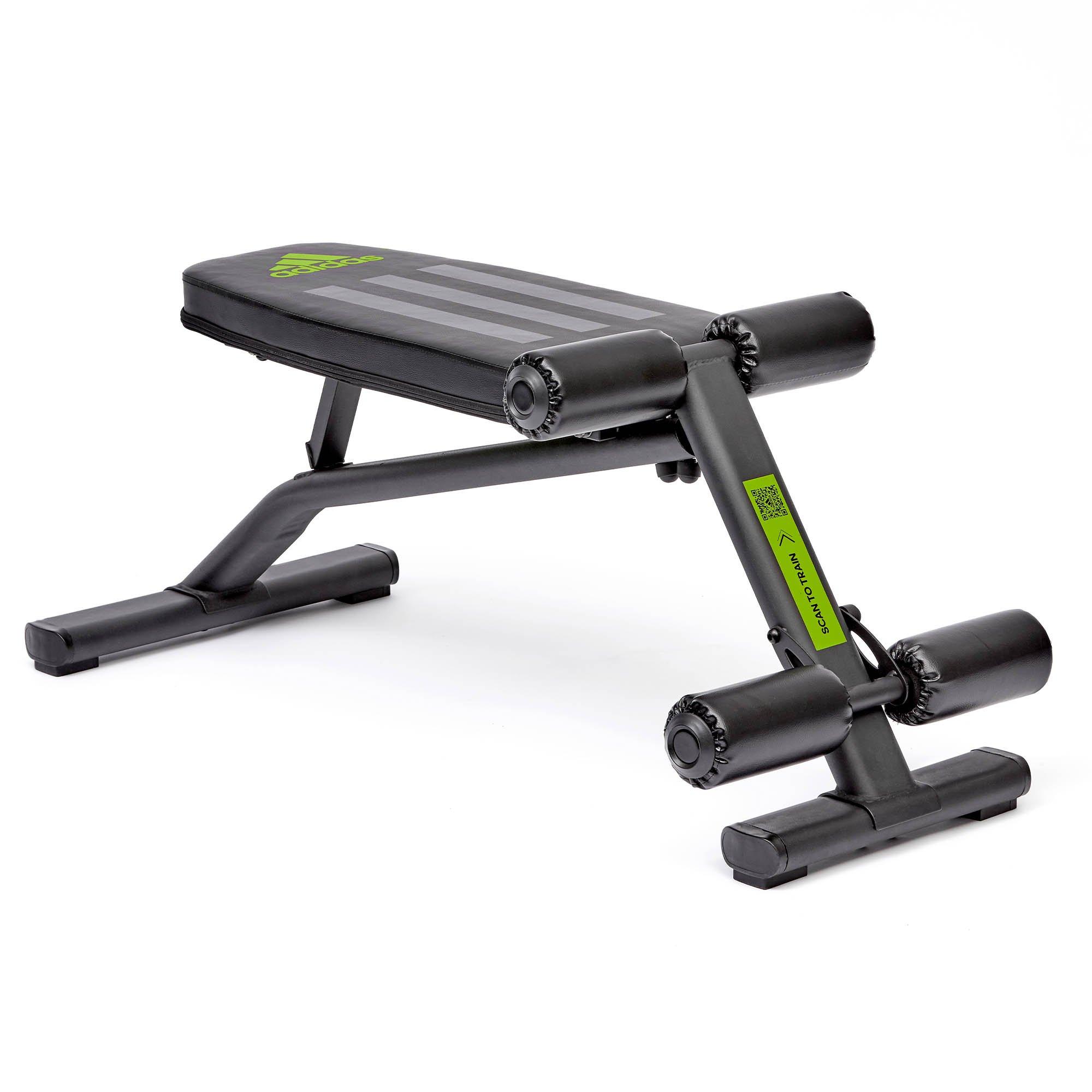 Part of adidas Performance range Solid steel frame Adjustable backrest with flat and decline positions 6.35cm thick, dense foam padding Designed for building strong abs and strengthening core muscles Knee and ankle foam rollers ‘Scan to Train’ feature for access to inspirational exercise videos Tapered back pad Wide base for added stability Easy to assemble Dimensions: Length=113.5cm (45”), Width=46cm (18”), Height=47cm (18.5”) Max. User Weight - 125kg Max. Load - 175kg Weight - 11.5kg 2-year warranty