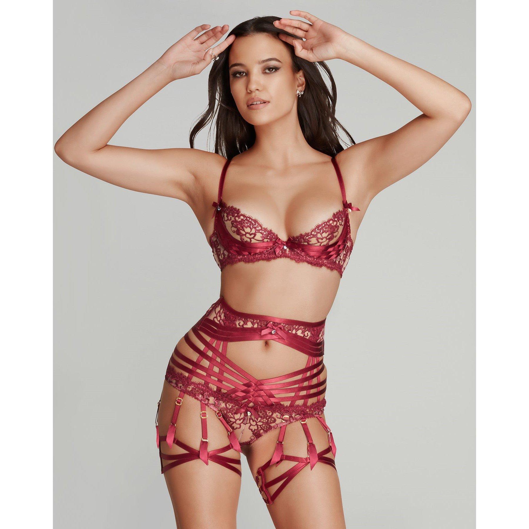 Burgundy suspender belt Swiss laser cut guipure embroidery Woven strapping detail around the waist for a bondage-inspired look 12 adjustable straps Hardware plating contains real gold for that signature AP touch Finished with a pretty satin bow and a Swarovski® crystal droplet Style with the rest of the Dioni range for all-powerful glamour