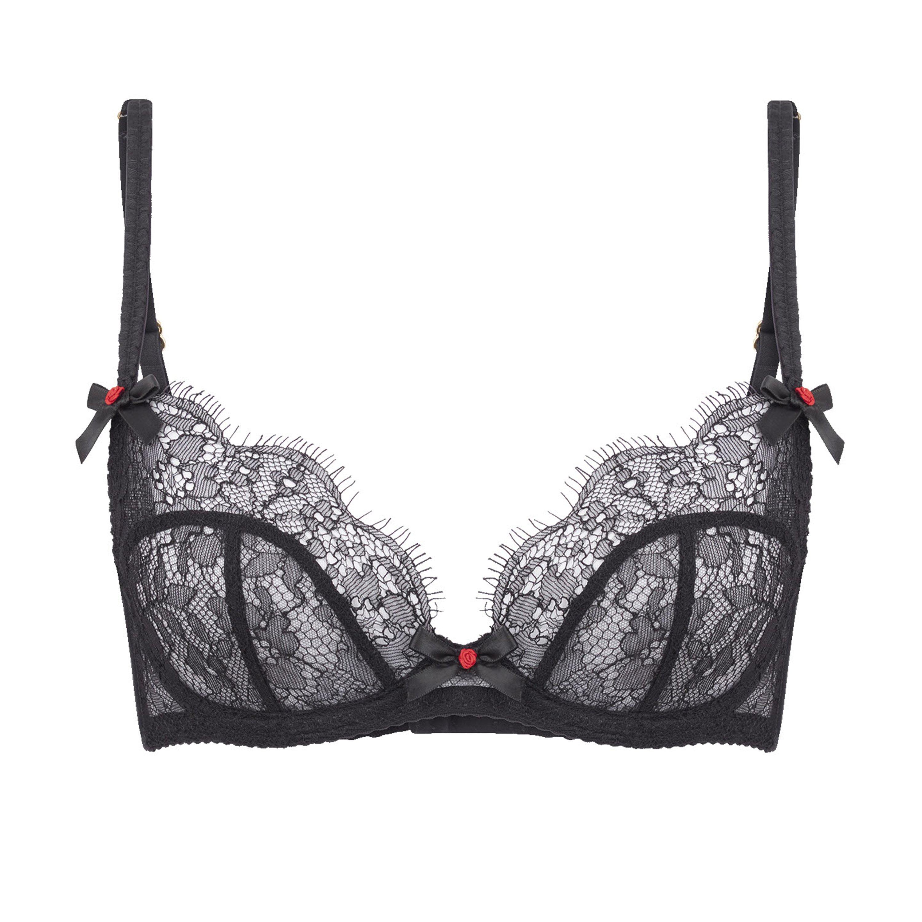 Black lace plunge bra Three part cups Satin bows with miniture rose detailing French seam detailing Scalloped edges