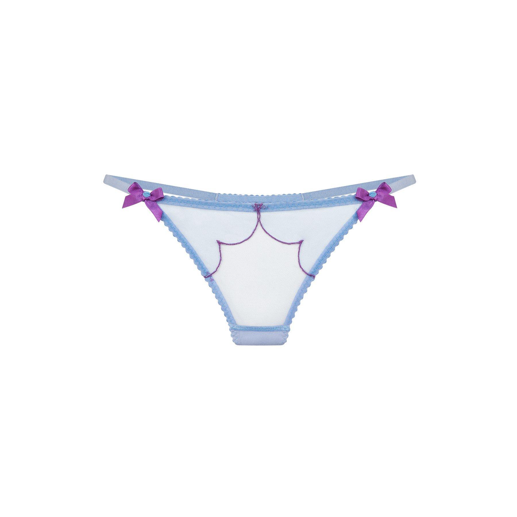 A bestseller for a reason, now back and looking hot in cool-toned purple and blue. A seductive thong-style brief with signature scalloped edges, embellished with satin bows and delicate rosebud details. Lorna is the perfect balance between sweet and sexy. Pair with the full Lorna set to experience pure AP pleasure.For hygiene reasons, this item cannot be returned for exchange or refund.