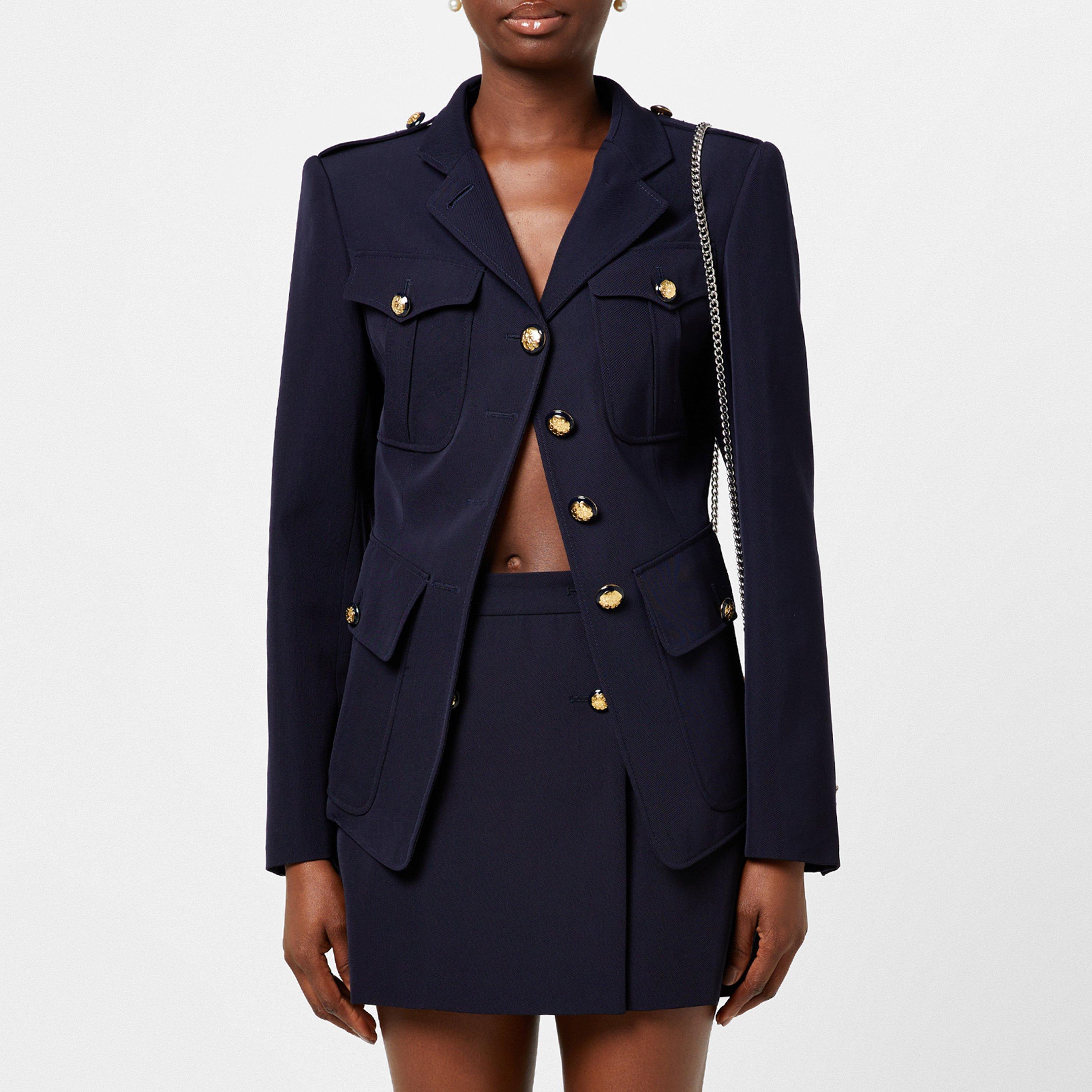 Solid block colouring delivers an exceptional foundation to style this women's military jacket into any ensemble, making it a versatile addition to your wardrobe. Adorned with gold-toned hardware for a spectacular touch, the Alexander McQueen labelling on the interior completes the design. Whether you are working from the office, attending the opening of a new gallery, or looking to elevate your everyday wear, Alexander McQueen's Asymmetrical Military Jacket is the perfect addition to your collection.