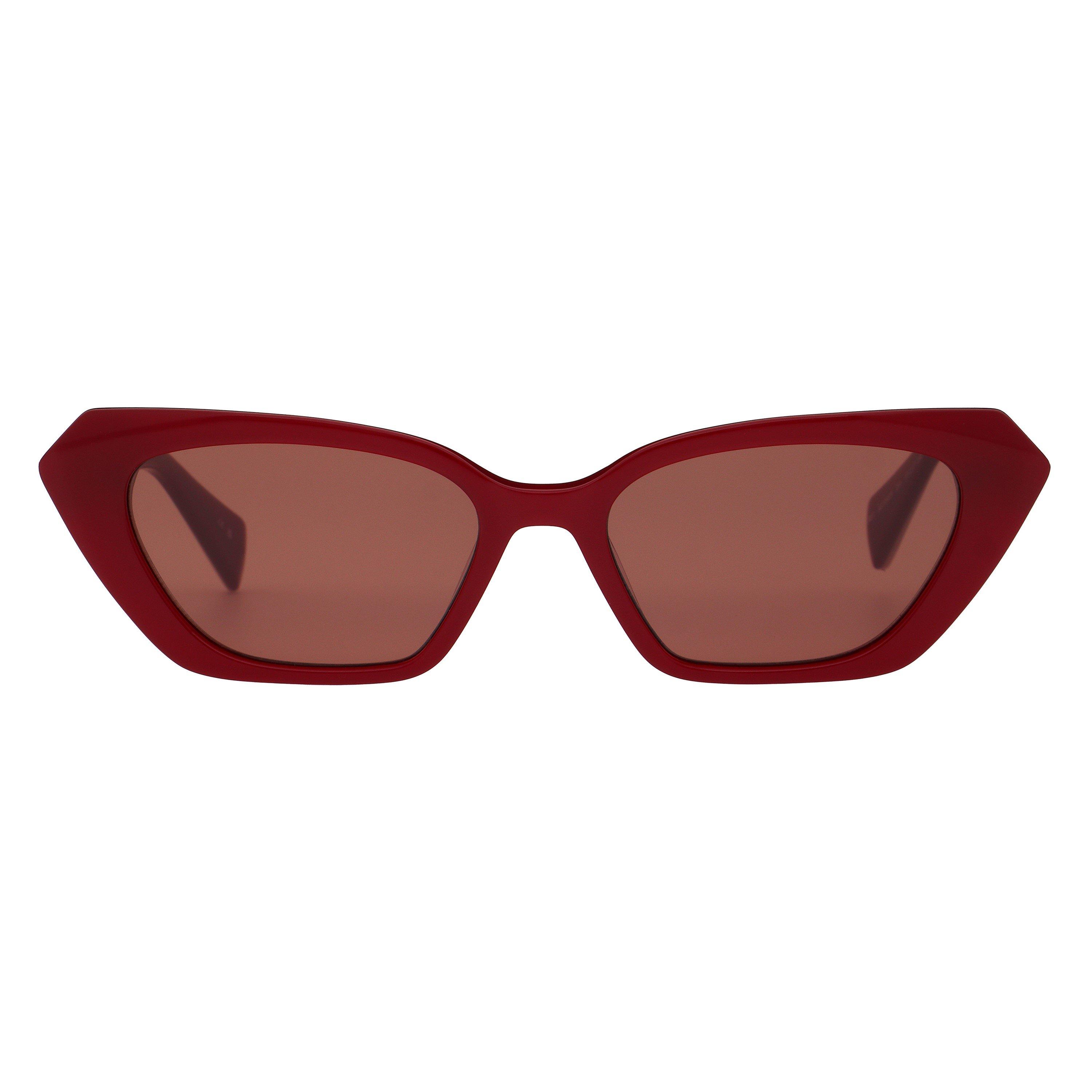 - Sculpted cat eye frames with sharp angles for striking facial framing