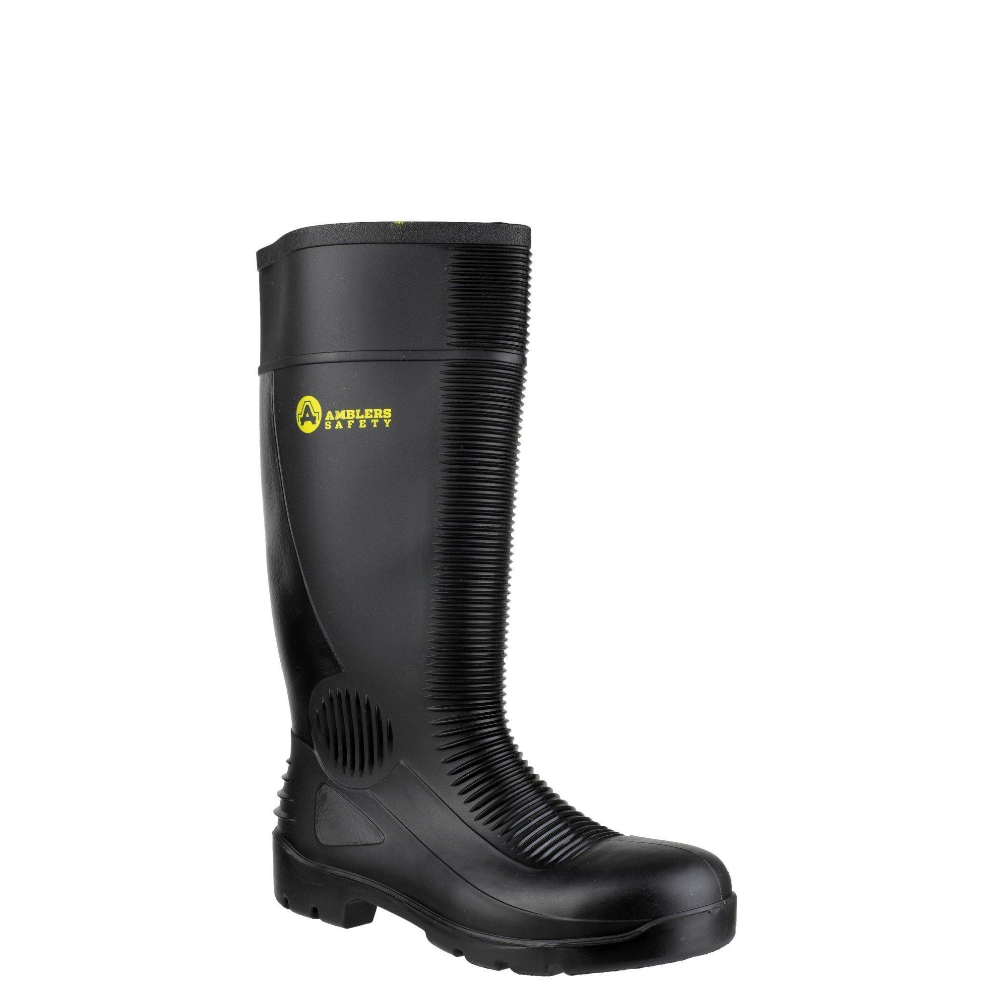 Lightweight, waterproof black PVC/Nitrile wellington with ribbed deflector panels ideal for labourers. Includes 200 Joule impact and compression resistant steel toe cap and underfoot protection is given with a steel midsole.
