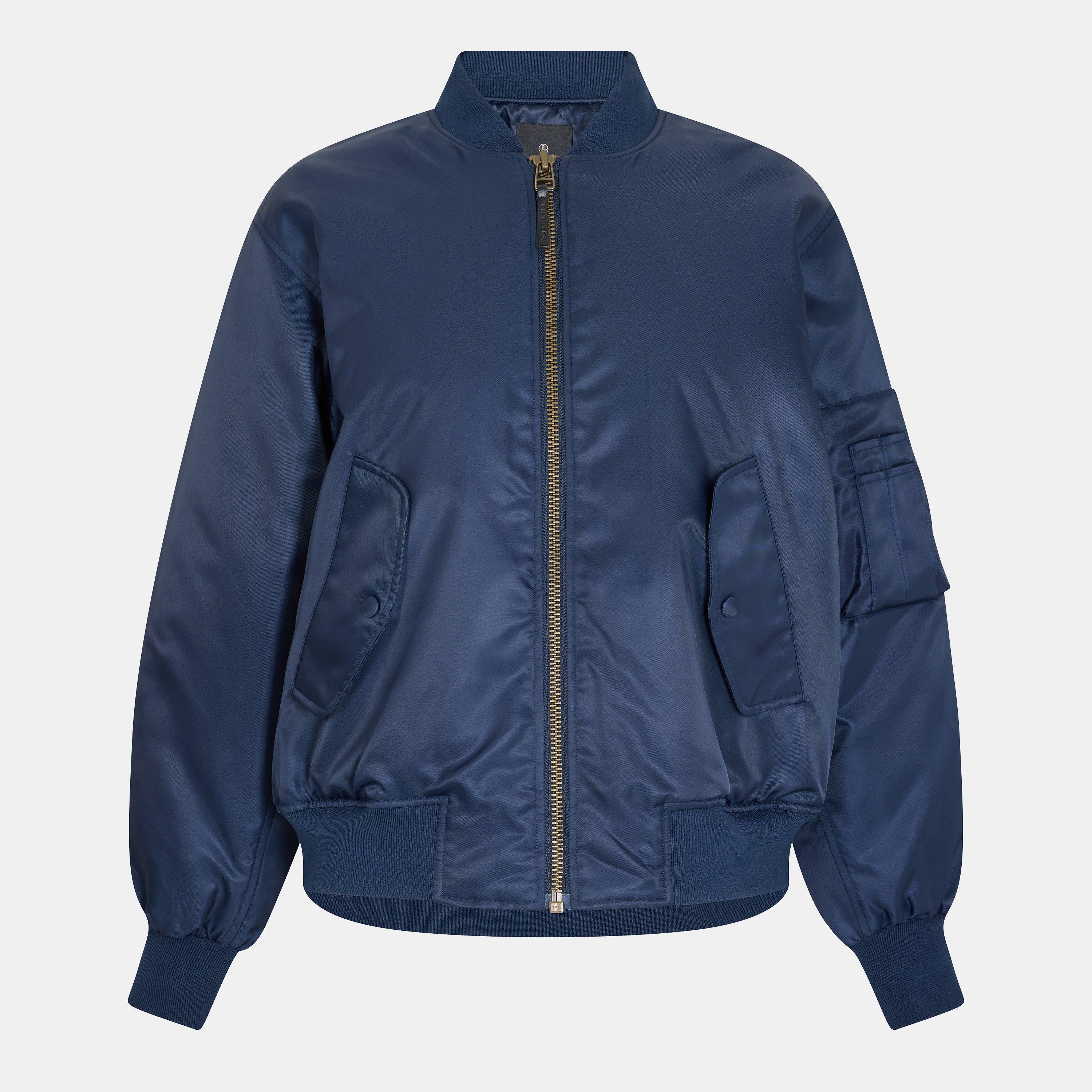 The Bomber Jacket from Anine Bing features structured shoulders and ribbed trims for a flattering fit suitable for casual wear.