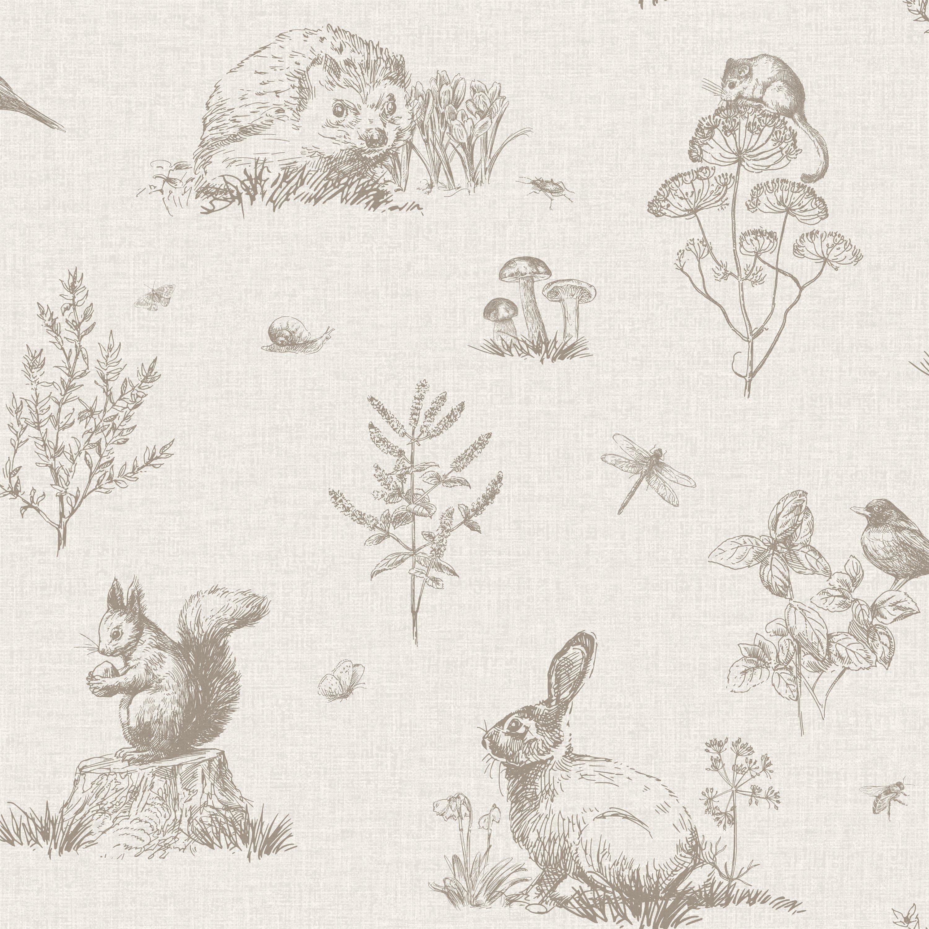 A lovely country design that creates a warm and inviting atmosphere. The linen effect background gives a soft, textured feel to any room whilst the woodland animals, insects & fauna add a touch of whimsy and charm. This type of wallpaper would be perfect for a variety of rooms in your home, including the bedroom, bathroom, nursery, or living room. It would also be a great choice for a mudroom or porch. Off Set 26.5cm 53cm repeat, Paper effect