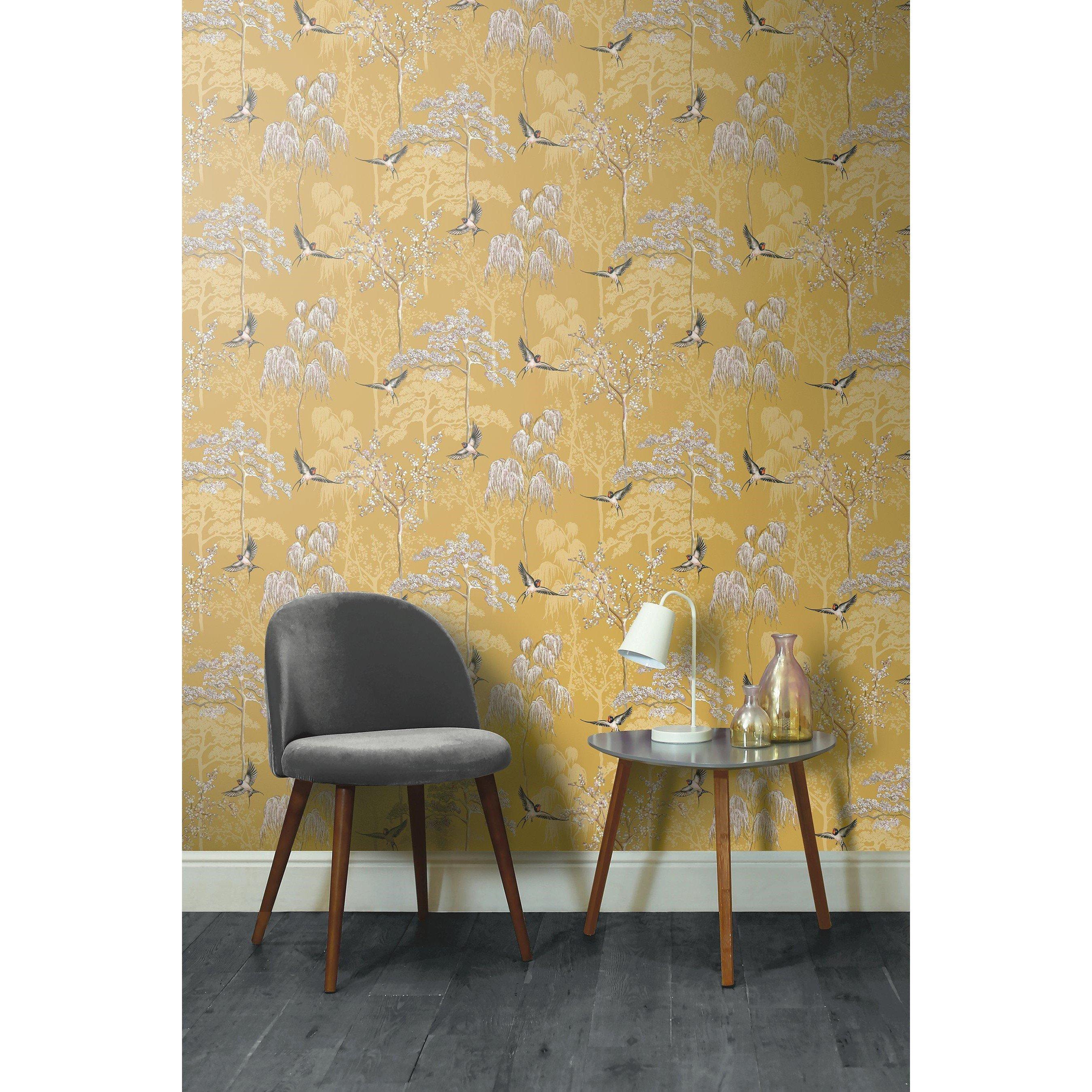Japanese Garden Ochre WalThis eye-catching and stylish wallpaper design is filled with beautifully hand drawn oriental trees and birds on a soft ochre coloured background.
