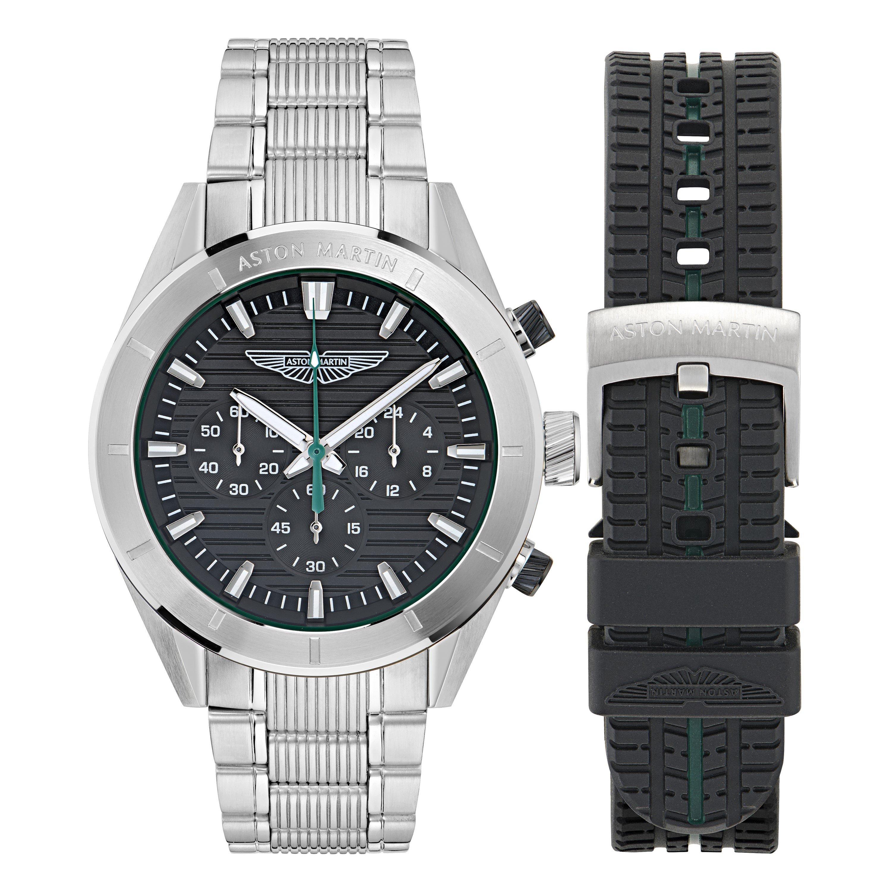 Stand out with BST, a chronograph designed for ultimate versatility and bold precision. Housed in a 45mm recycled stainless steel case, BST features a textured black dial with three counters, combining powerful functionality with a clean and sophisticated aesthetic. The boxset includes three interchangeable top rings—in silver, black, and Aston Martin’s iconic Podium Green—allowing you to customize the watch’s appearance to suit any occasion.