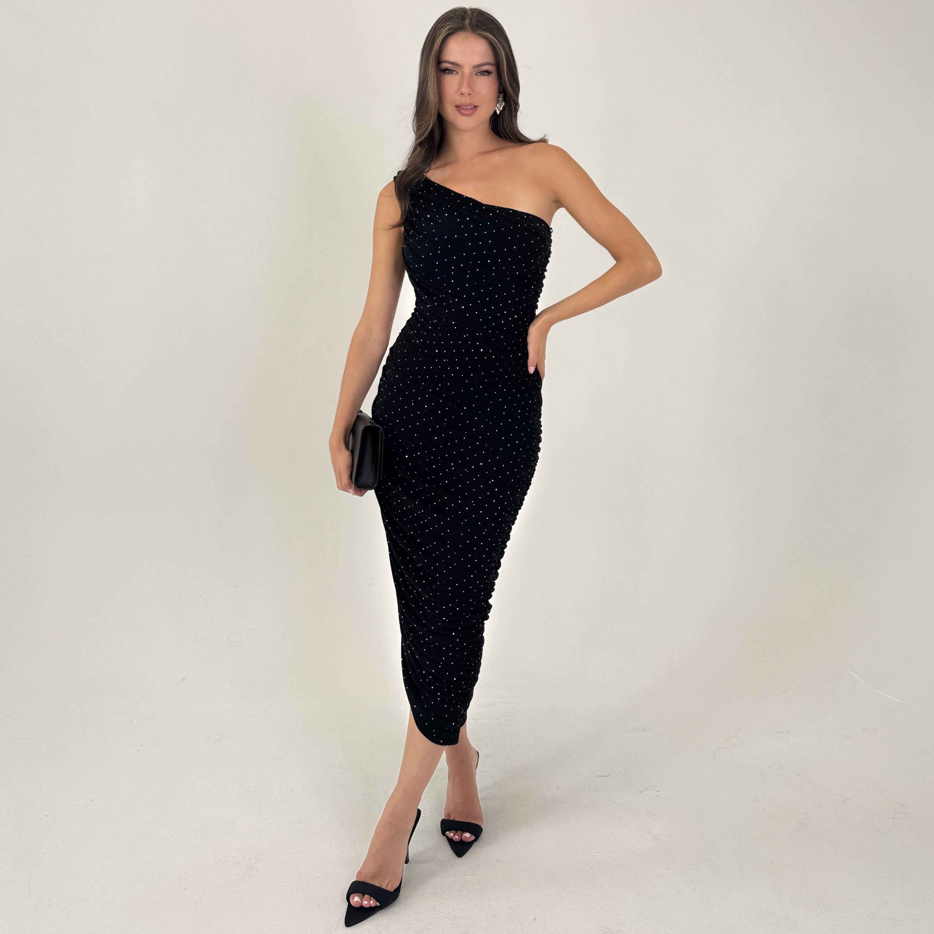 Make an unforgettable entrance in our Black Diamante Sparkle One Shoulder Ruched Midi Dress. Crafted from our stunning sparkly stretch fabric with diamante studs, it features a curve-enhancing silhouette, full lining, a one shoulder top, ruched detailing along the body and an asymmetric hem. Team it with strappy heels and a clutch for a glam party season look.