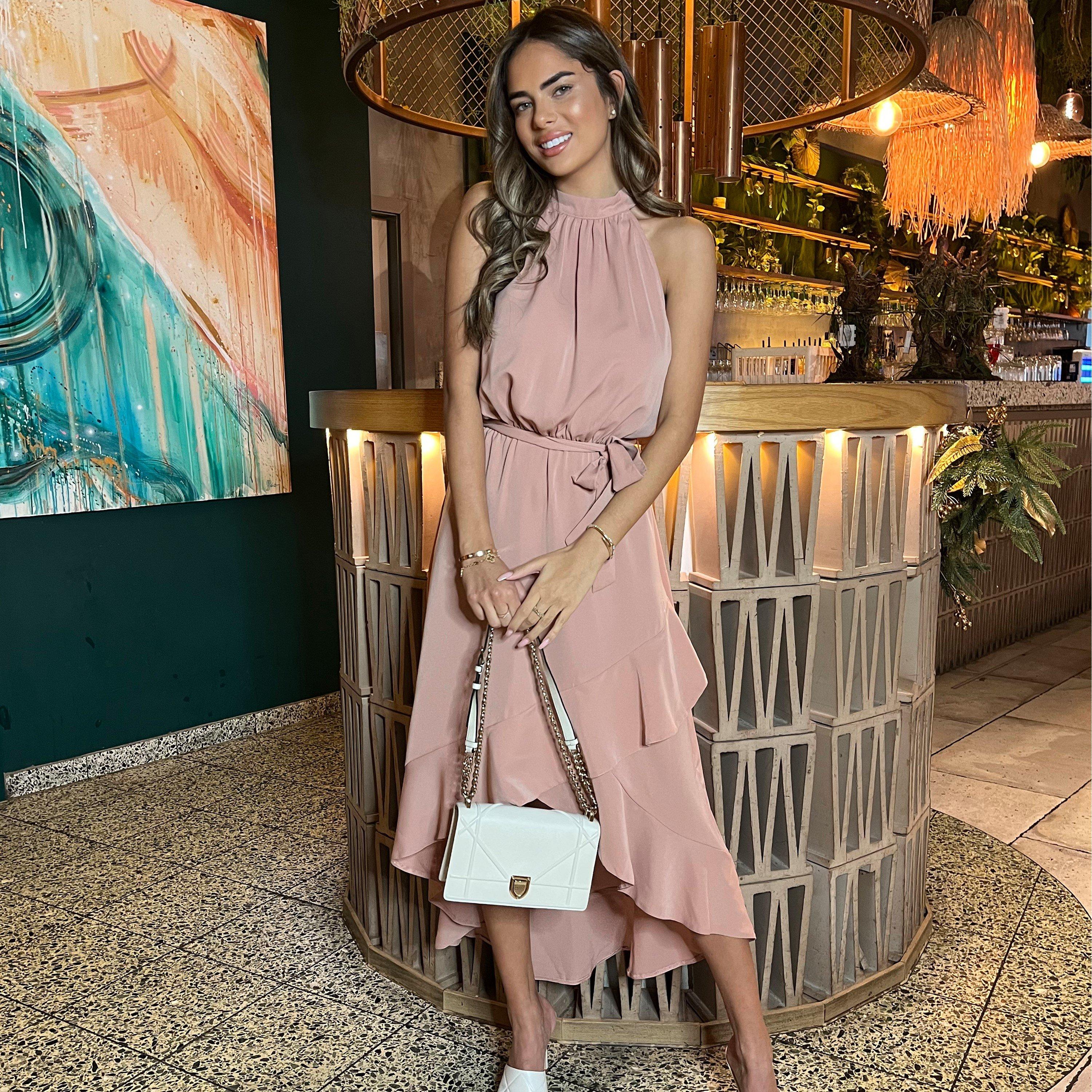 Our Blush Halterneck Dipped Hem Midi Dress is the perfect occasion dress for this season. Featuring a halterneck style with button fastening, an elasticated waist back with waist tie, and an asymmetric dipped hem skirt with frill hem. Dress up this midi with cream heels and a mini bag.