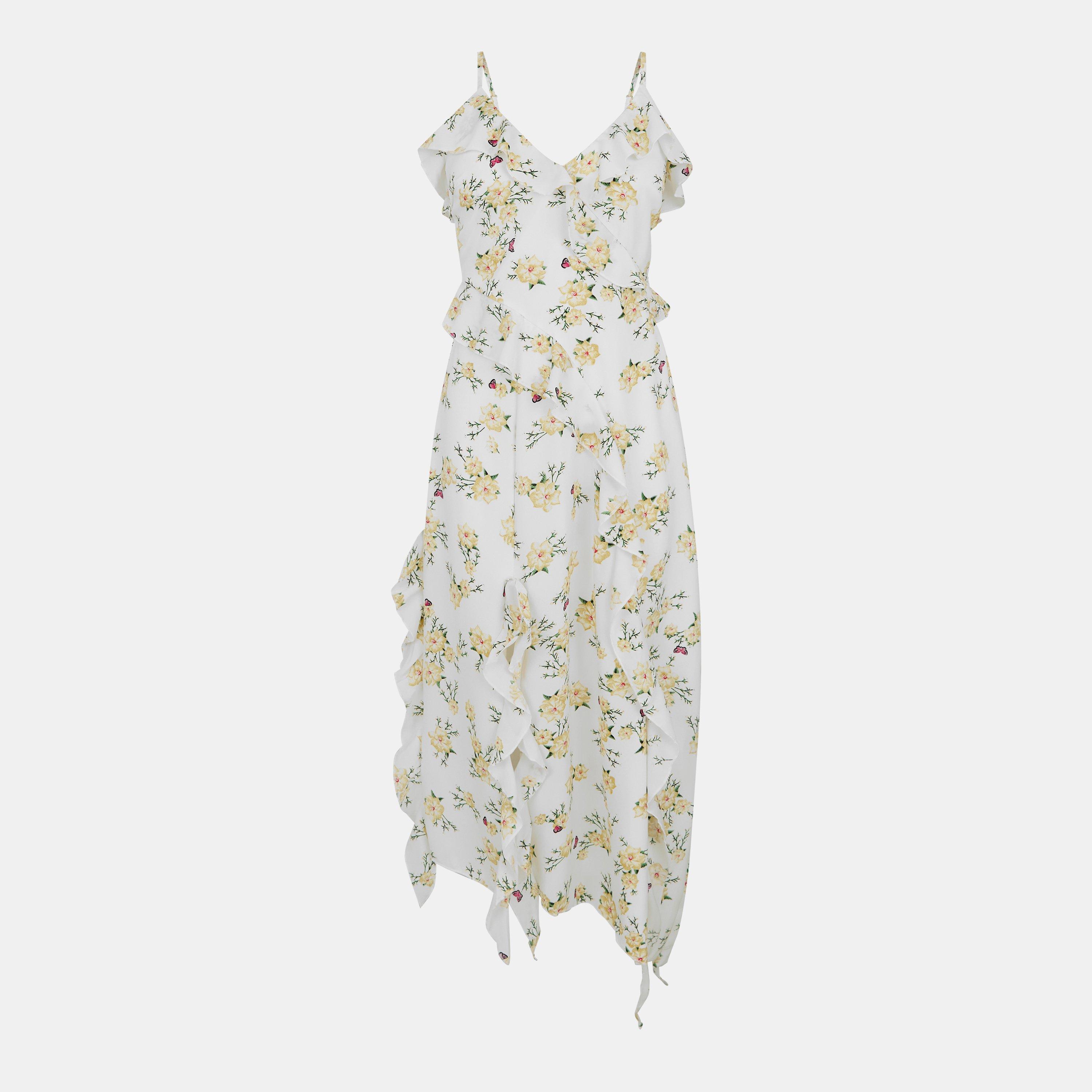 Our Cream Floral Printed Strappy Frill Hem Midi Dress will be your new season obsession. Featuring a v-neck top with frill detailing, adjustable straps, zip-up back, and a light skirt with an asymmetrical frill hem. Dress it up with nude heels and a mini bag for the perfect summer occasion outfit.
