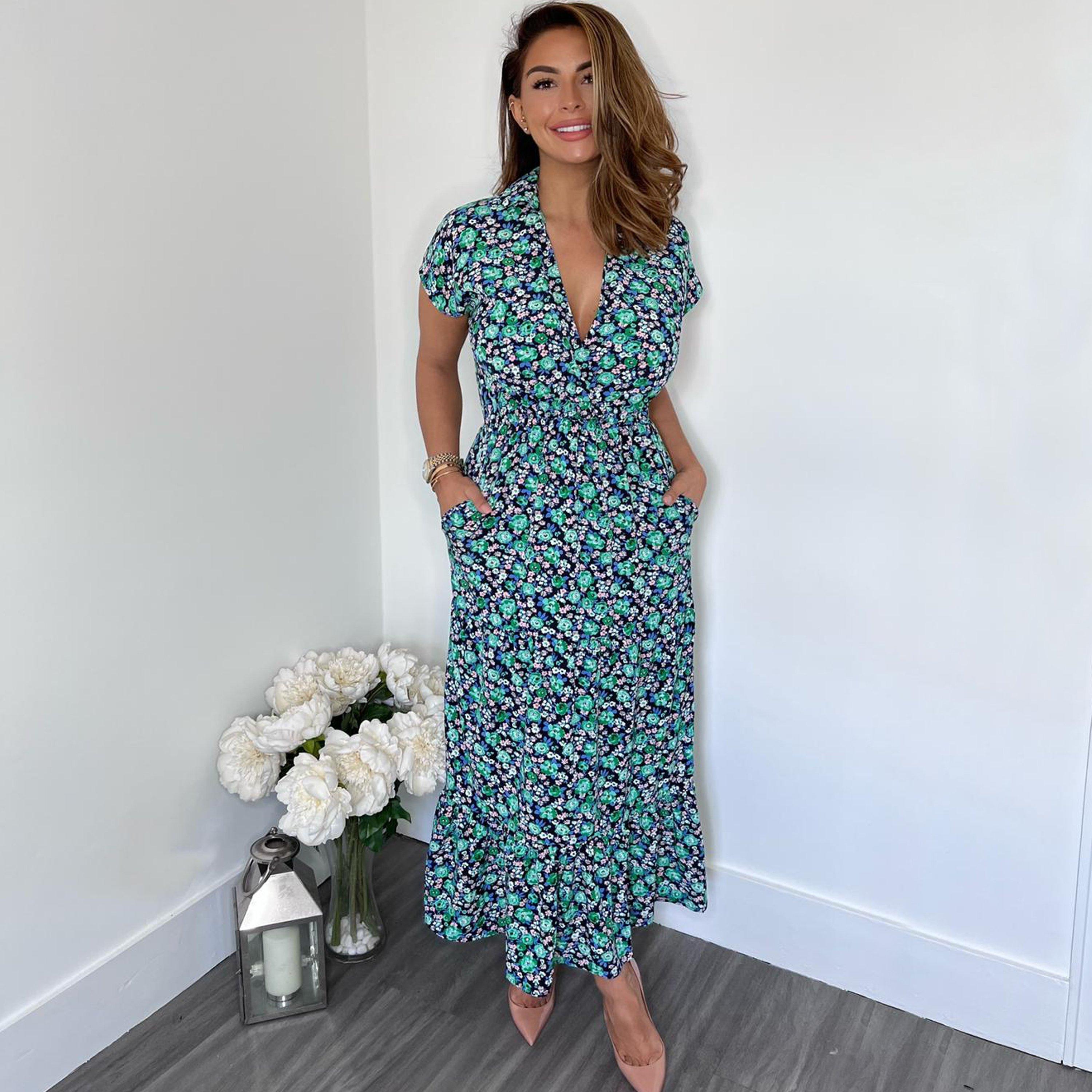 Our Navy Floral Print Short Sleeved V-Neck Midi Smock Dress is a wardrobe must have. Featuring a v neck cross over style top with short sleeves, a layered swing style skirt and pockets! Pair with some cute trainers and a cute headband to complete the look!