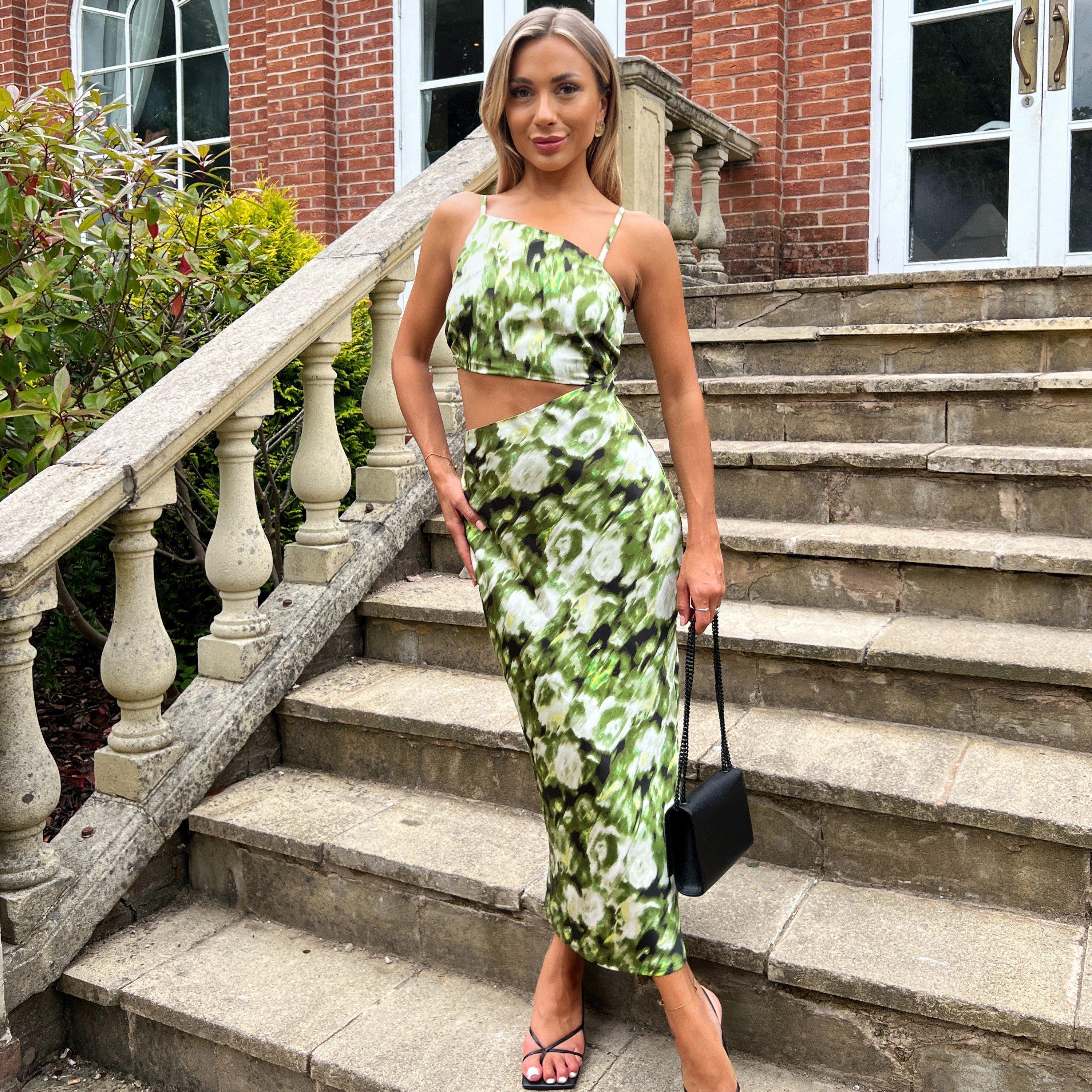 Our Green Printed Asymmetric Cut Out Midi Dress combines a classic silhouette with a modern cut out detail, making it the perfect party dress! Featuring an asymmetric neckline, spaghetti straps, an asymmetric cut out detail, body lining, side zip and a midi length skirt. Pair with barely there heels and a some simple jewellery for a sophisticated evening look.