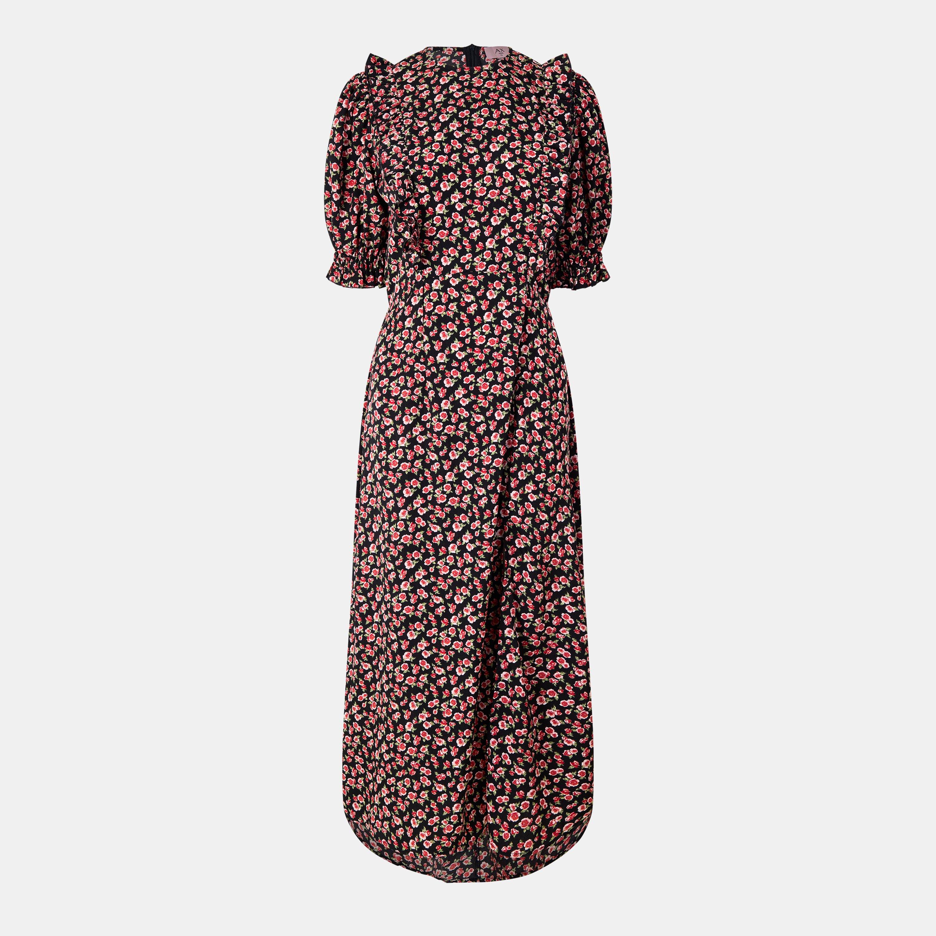 Feel sophisticated in this Multi Rose Printed Frill Detail Midi Dress ! Features a high neck, pleated frill puff short sleeves, a split leg and a zip up back. Pair with barely there or black sandals for an effortless glam look!