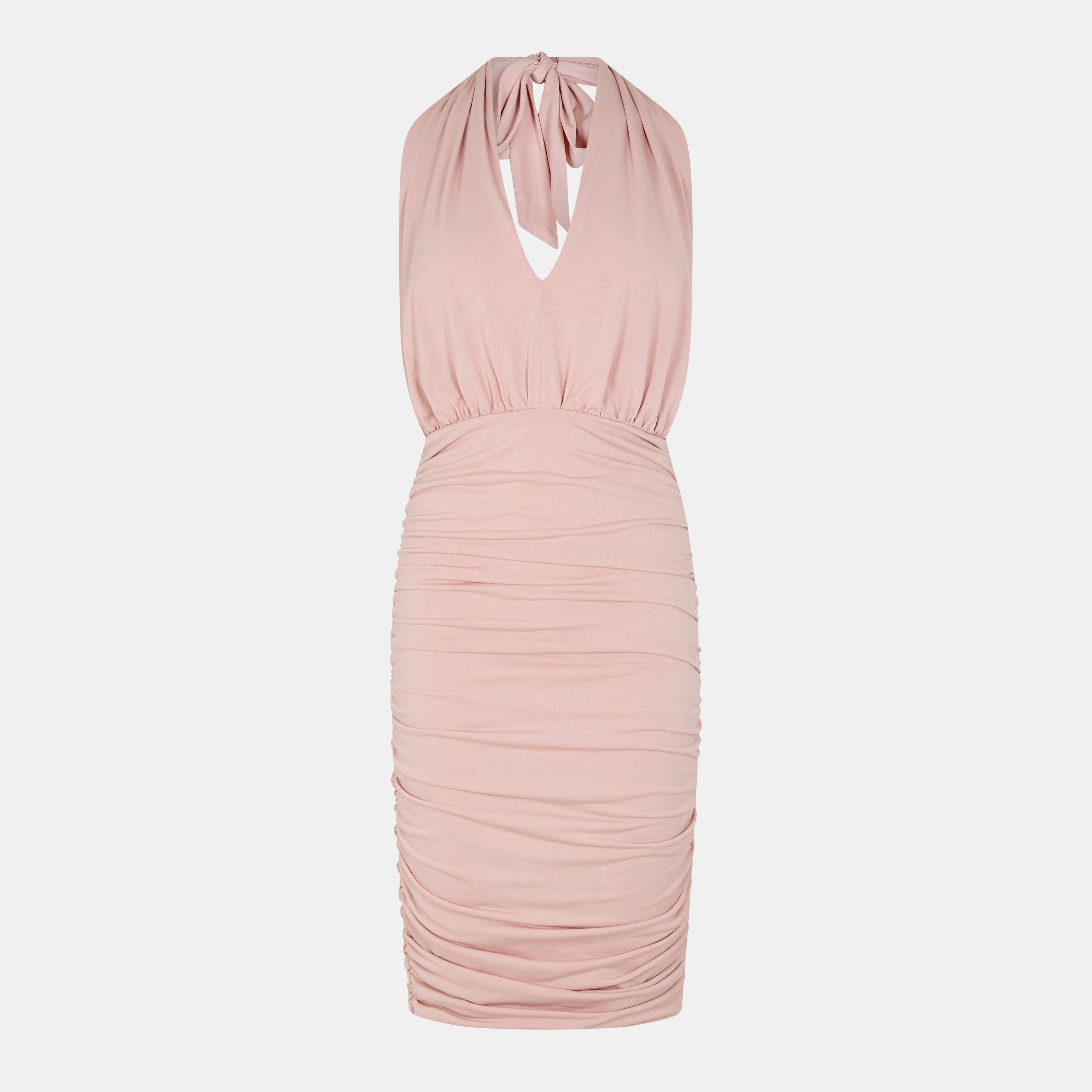 Turn heads in our Nude Halter Tie Neck Ruched Midi Bodycon Dress! This ruched side bodycon dress with a tie halter neck is super flattering. Glam it up with some gold accessories and some killer heels!