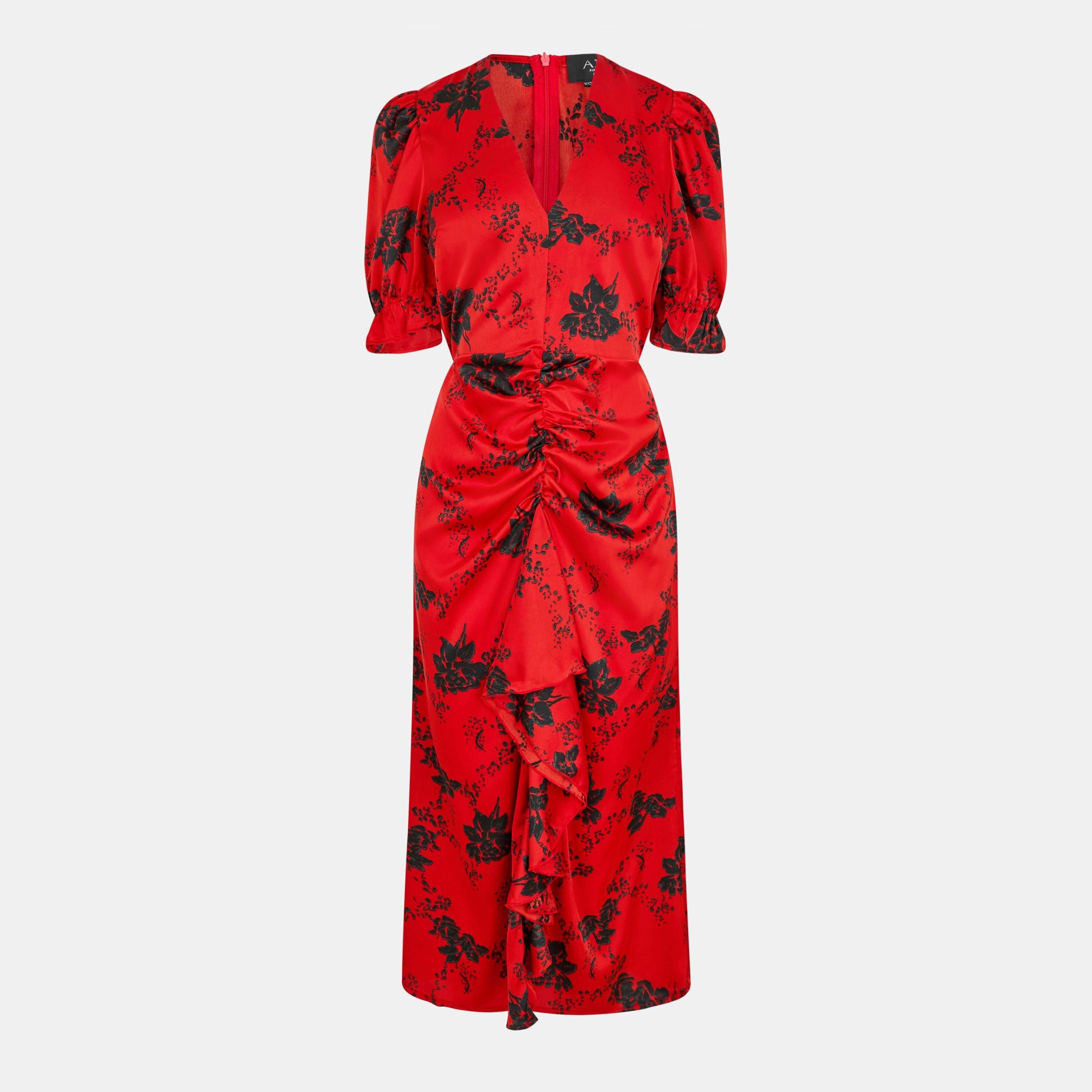 Our Red And Black Printed Frill Front Midi Dress is right on trend this season! Featuring a v neck, ruched front and elasticated short sleeves. It's perfect for that upcoming special occasion! Simply pair with heels for a sophisticated look.
