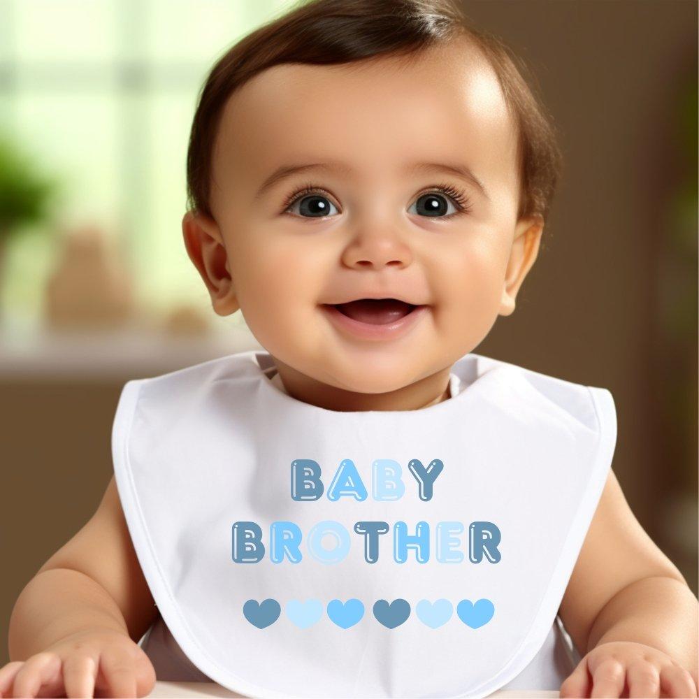 Our cute baby bib makes a sweet addition to an outfit for any occasion, either a 1st Birthday, announcement or cake smash. It can be kept as a lovely keepsake gift too. This design has the words 'Baby Brother' and with a row of blue hearts. Our baby clothing is printed on meaning they keep their soft and gentle feeling.