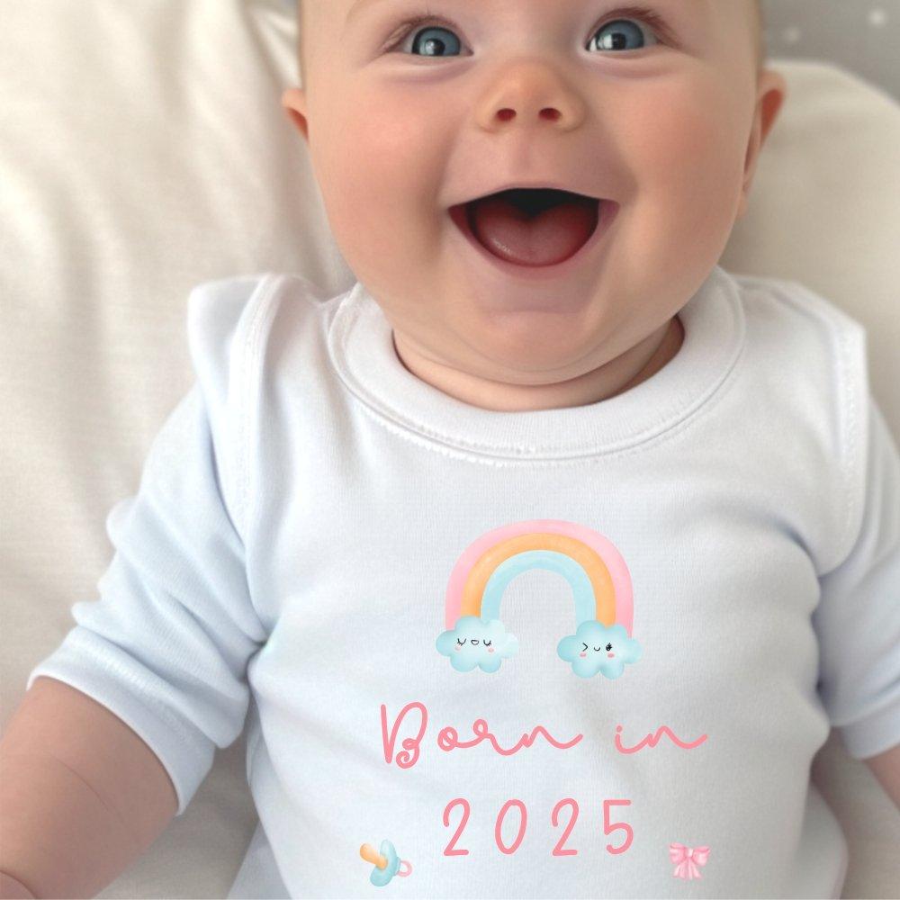 Our cute 'Born in 2026' baby grow makes a lovely gift for a newborn baby present with the pink font and rainbow. It makes a perfect gift for a newborn or even as a special keepsake. This would also be cute to use as a pregnancy announcement. Our baby clothing is printed on meaning they keep their soft and gentle feeling.