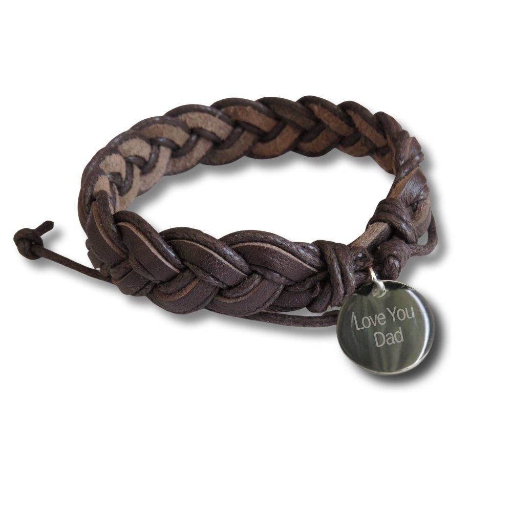 Our mens multi-strand pleated leather & cord bracelet is pre-engraved with the words 'Love You Dad' to make an extra special gift. The personalisation comes on a highly polished 16mm Stainless Steel disc. finished off with adjustable cord to fit comfortably. A lovely gift for a modern laid back man for a Birthday, Fathers Day or Christmas.