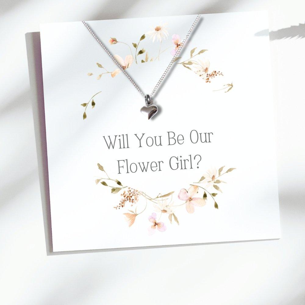 This flower girl silver heart charm necklace is a charming gift for the little one who will be a part of your wedding day. The delicate design features a heart charm and is a thoughtful way to ask, Will you be my Flower Girl? Perfect for making your flower girl feel special and appreciated.
