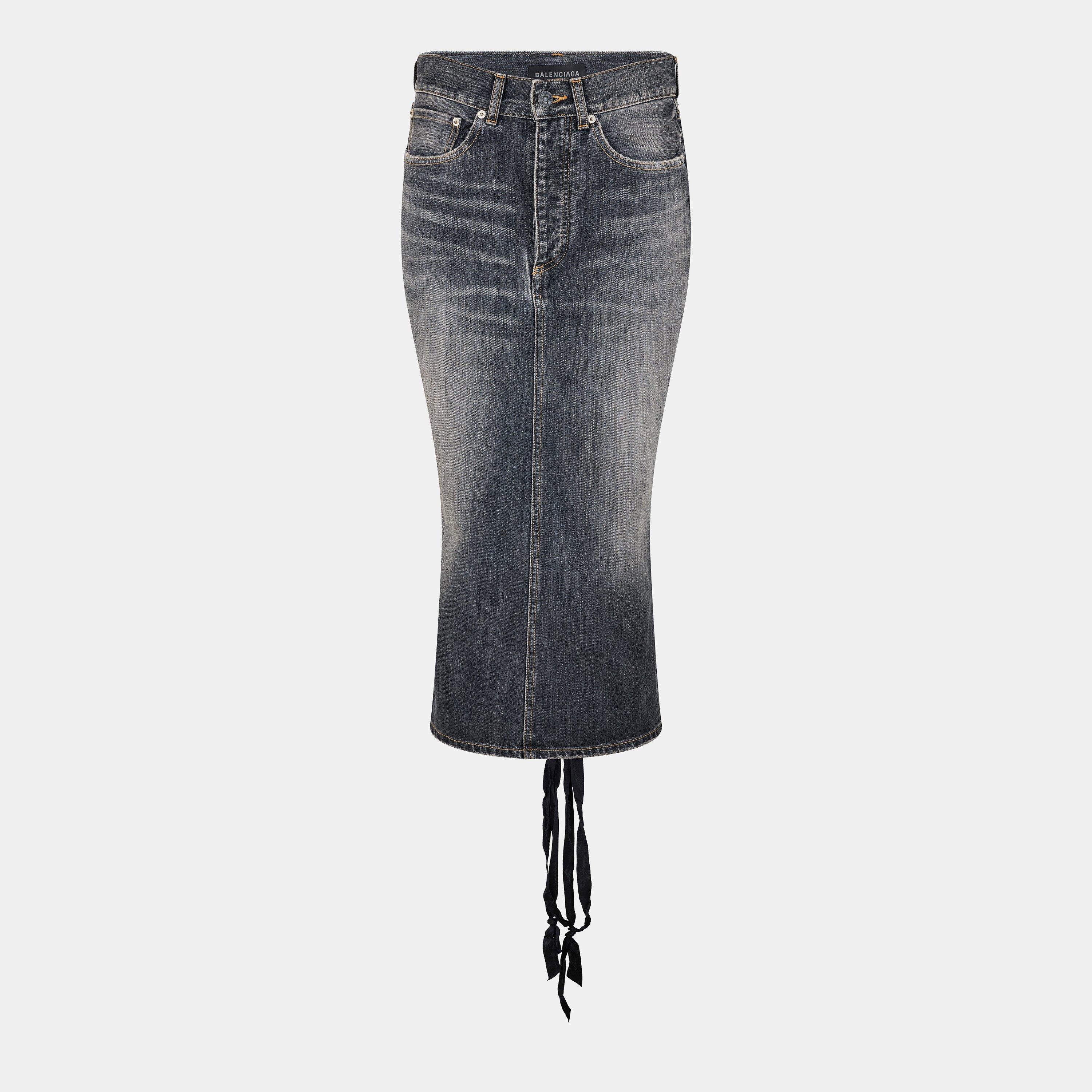 Balenciaga's Lace-Up Jean Skirt brings contemporary edge to a wardrobe classic. The front lacing detail offers both adjustable fit and standout style, while the structured denim ensures the mid-length cut maintains its shape throughout wear.
