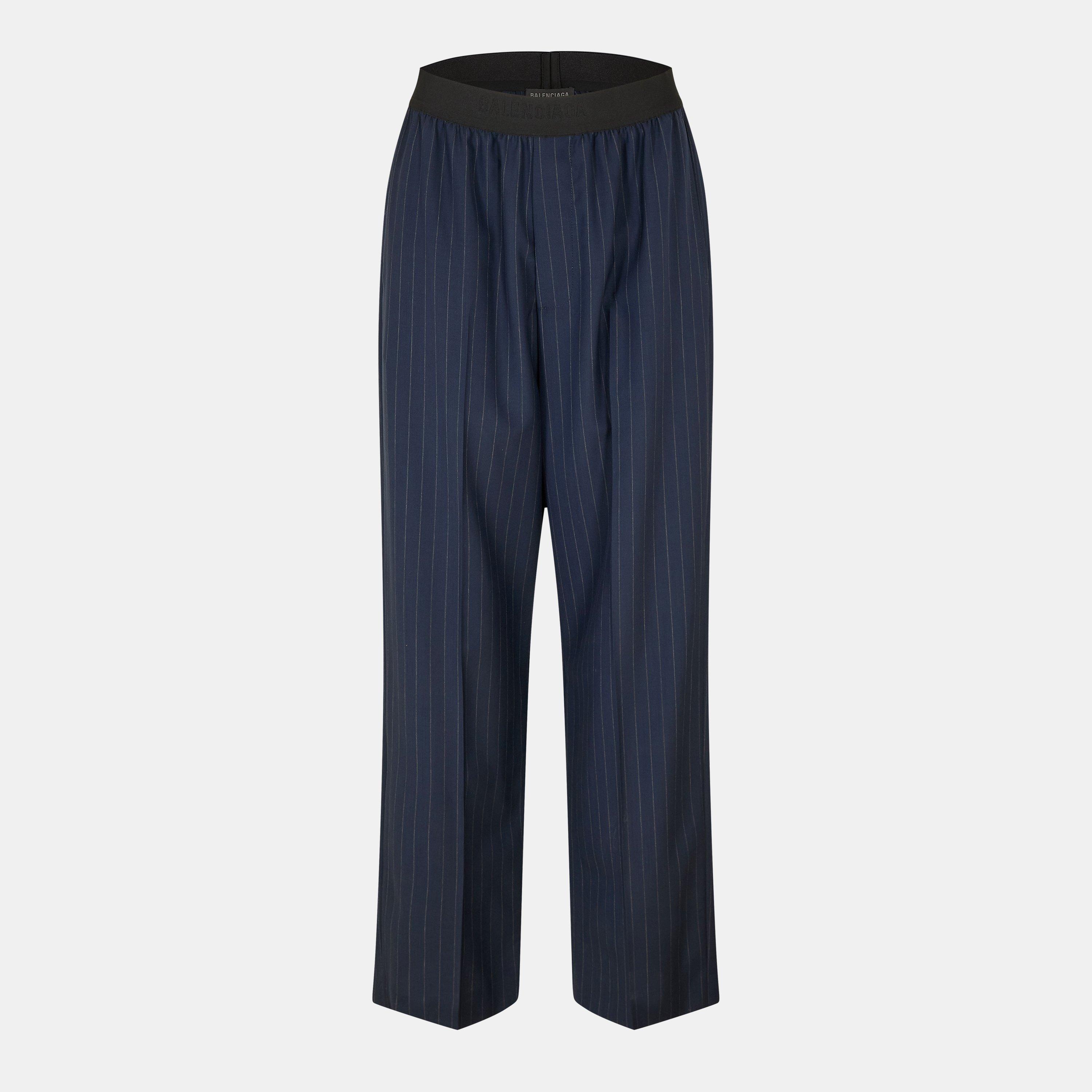 The Balenciaga Women's Pinstripe High Rise Relaxed Fit Wide Leg Trousers bring classic tailoring with a flowing design. Cut with a high-rise waist, these trousers feature classic pinstripe detailing and a relaxed, wide-leg shape.