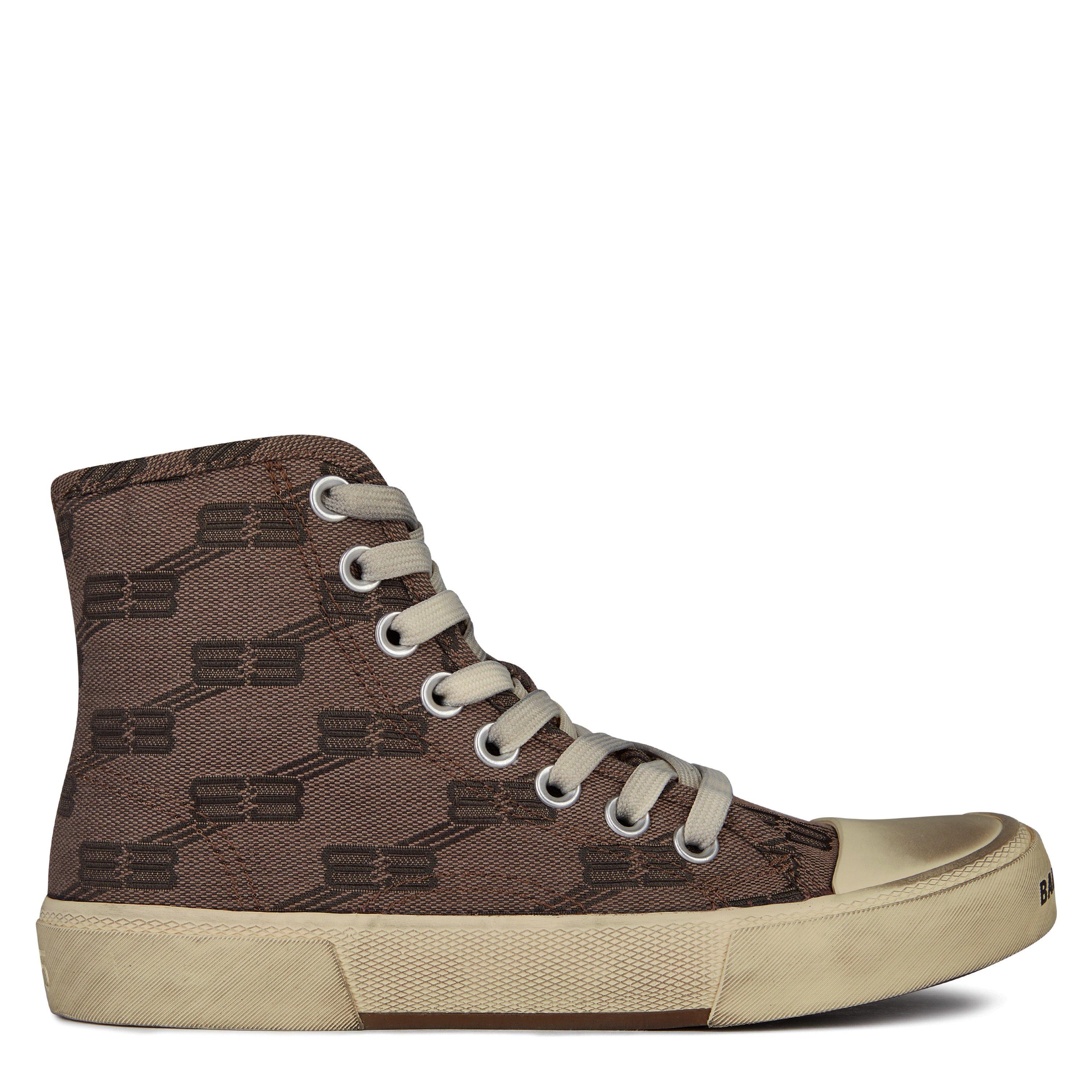Update your casual ensemble with the BB Monogram Paris Hi-Tops from Balenciaga. Crafted in a timeless silhouette, a cotton and rubber adorns a vulcanised sole and features a round toe, metal eyelets and lace up fastenings and an all over BB embroidered monogram print. The design is finalised with the Balenciaga logo etched into the outer-sole treads and a washed effect for a pre-loved aesthetic in keeping with the brand image.