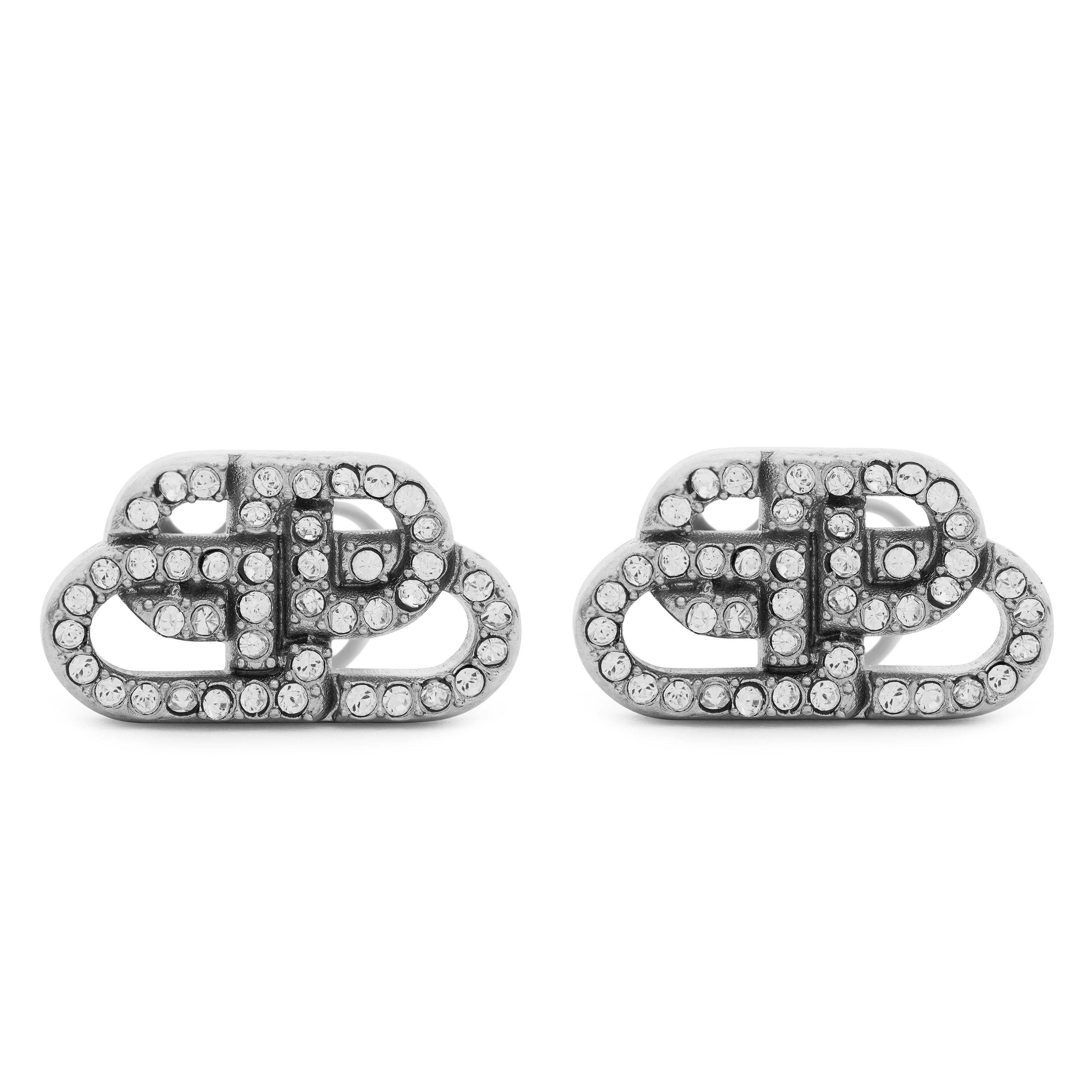 Add some sparkle to your staple jewelry collection with the Balenciaga BB XS Stud Crystal Earrings. Crafted from a premium brass with a silver-toned coating, this petite silhouette boasts the iconic interlocked BB logo embellished with rhinestones for a touch of elegance. With a BB charm to the back closure, this pair are perfect to match with other accessories to add a statement touch to your look. Sold with a dust bag.