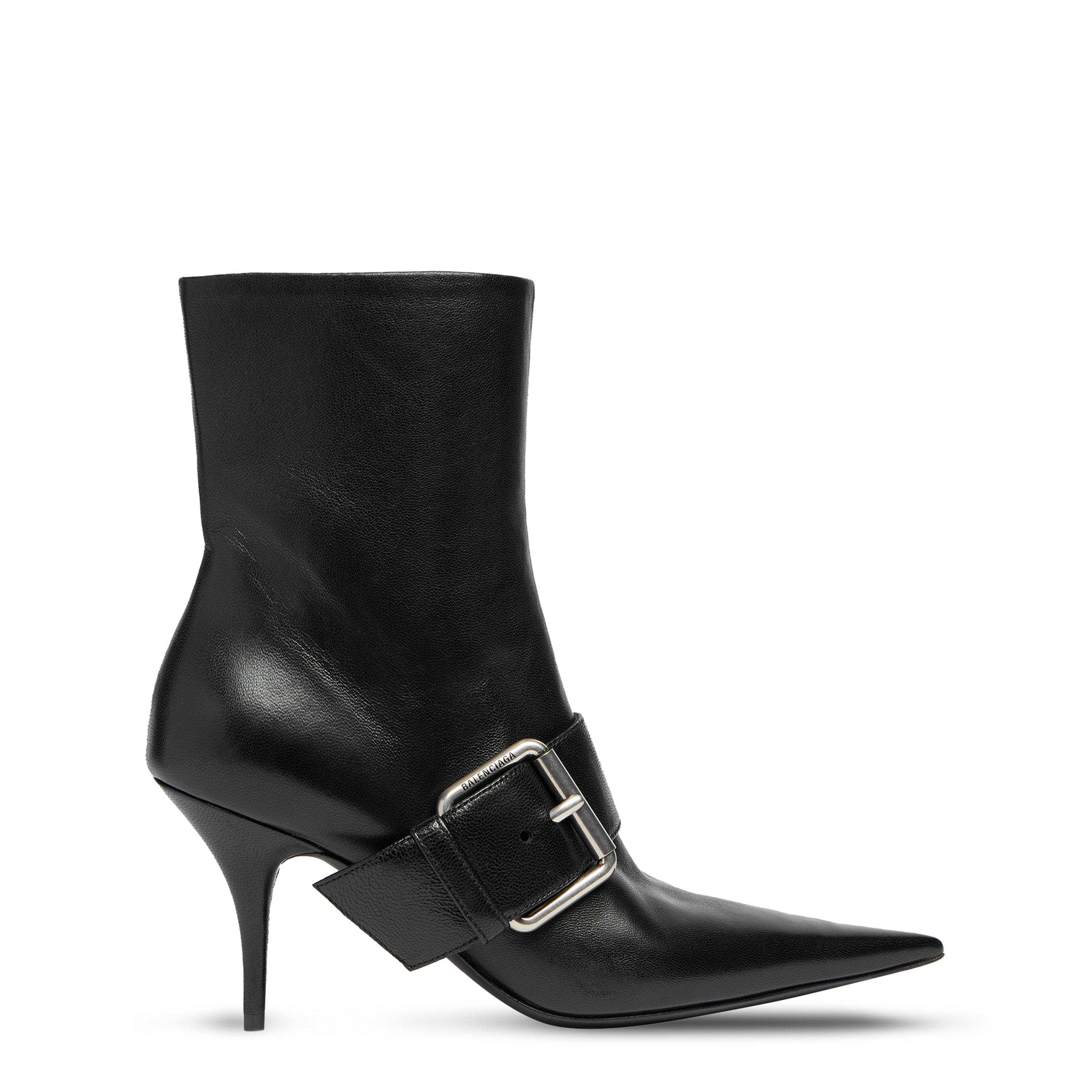 Renowned for combining minimalist aesthetics with avant-garde influences, the Balenciaga Knife Buckled Leather Ankle Boots are designed to become a cult staple in your collection. As the name suggests, these boots are defined by their mesmerising pointed toes and razor-sharp stiletto heels, elevating any ensemble with a striking and sophisticated edge. The smooth black leather exudes a timeless elegance, while the wrapped straps, reminiscent of a buckled belt, add a touch of visual intrigue and contemporary flair.