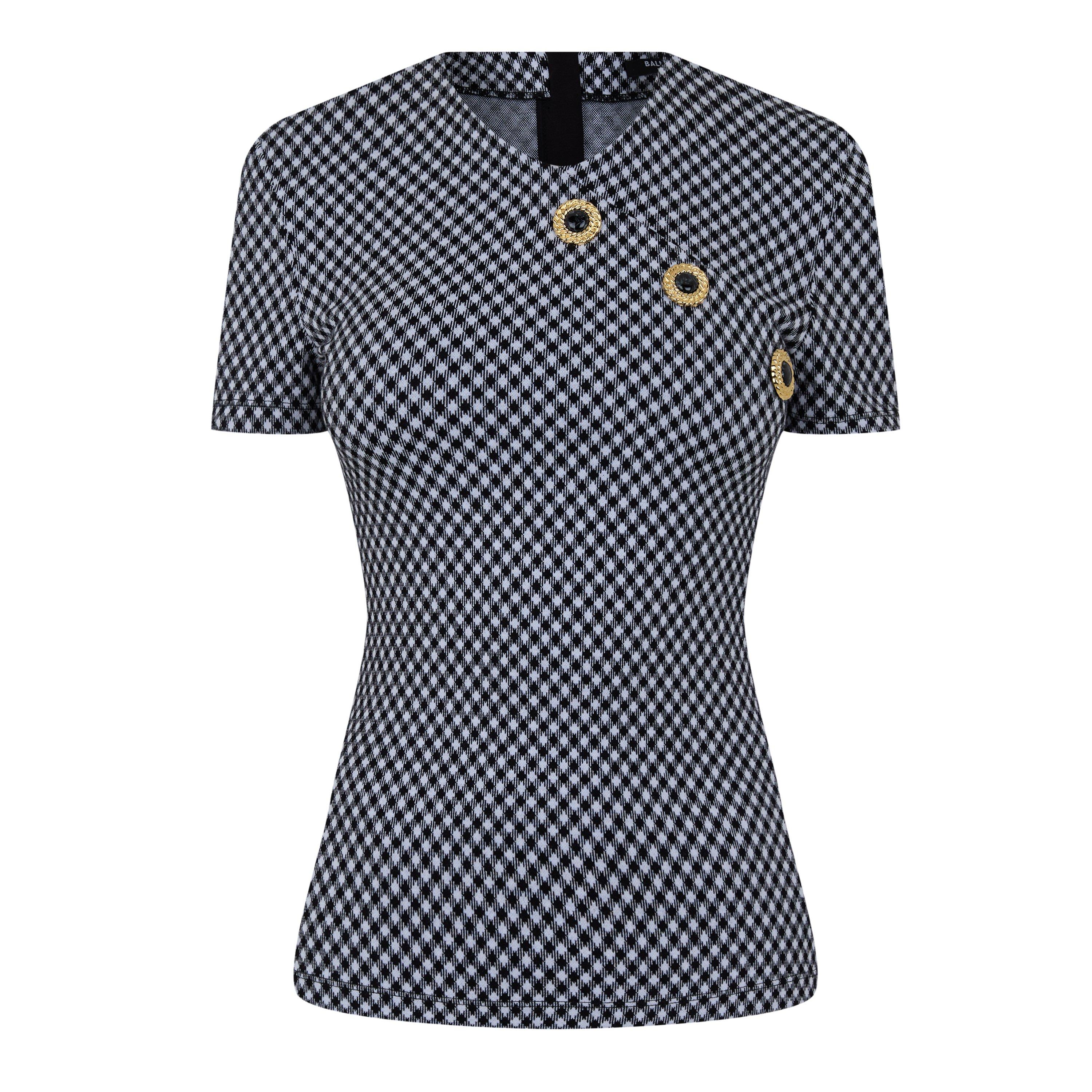 Balmain's Check Wrap Top showcases the house's aesthetics with structured tailoring. The check pattern features gold-tone hardware detailing for a sharp shape with Balmain identity.