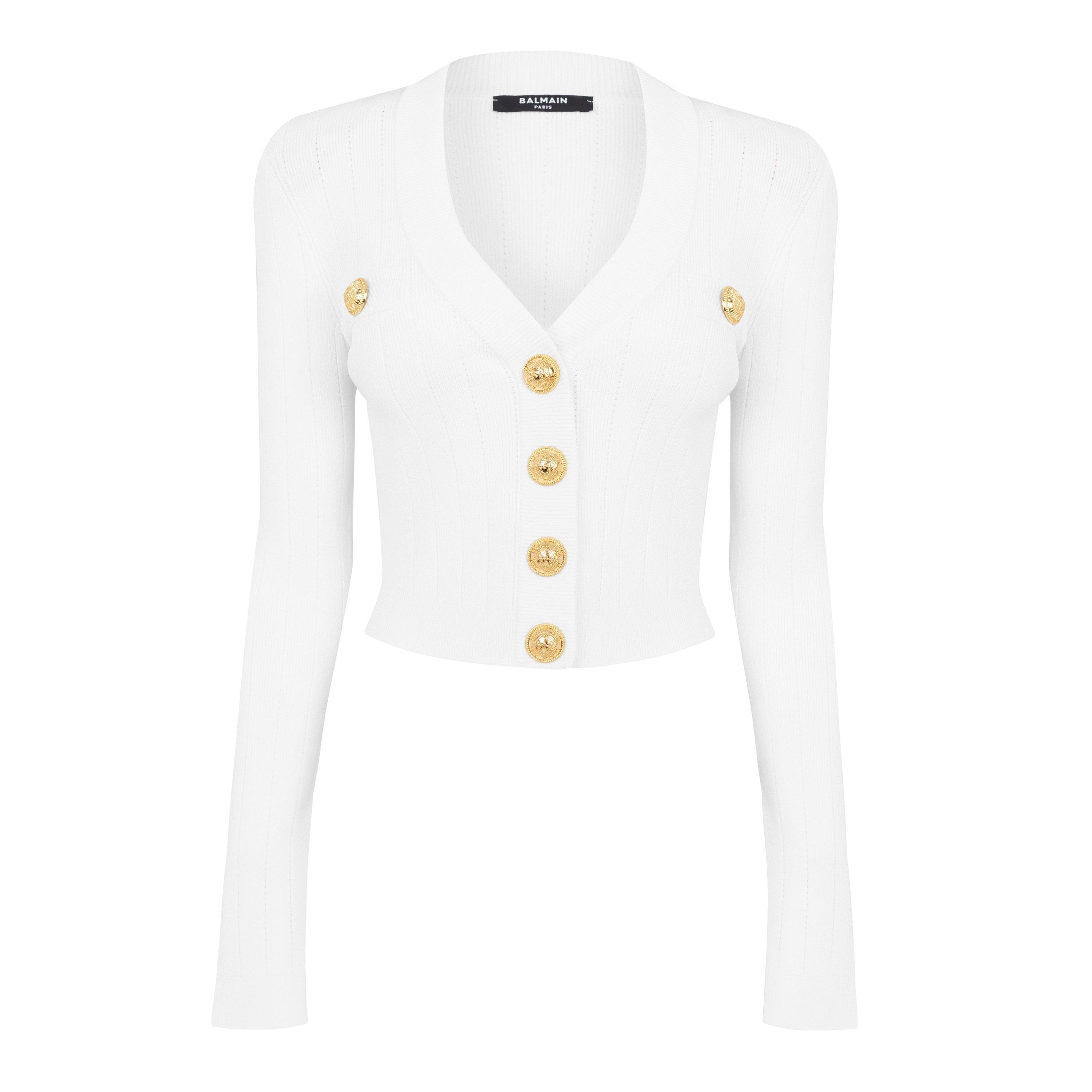 Refresh your premium knits with the Crop Button Cardigan from Balmain. With a V neck alongside ribbed trims to the sleeves, hem and neckline, this cardigan is made in a textured knit for all day comfort. With a gold toned branded popper button fastening adding a premium touch, this cardigan is finished with matching accent buttons to the chest.