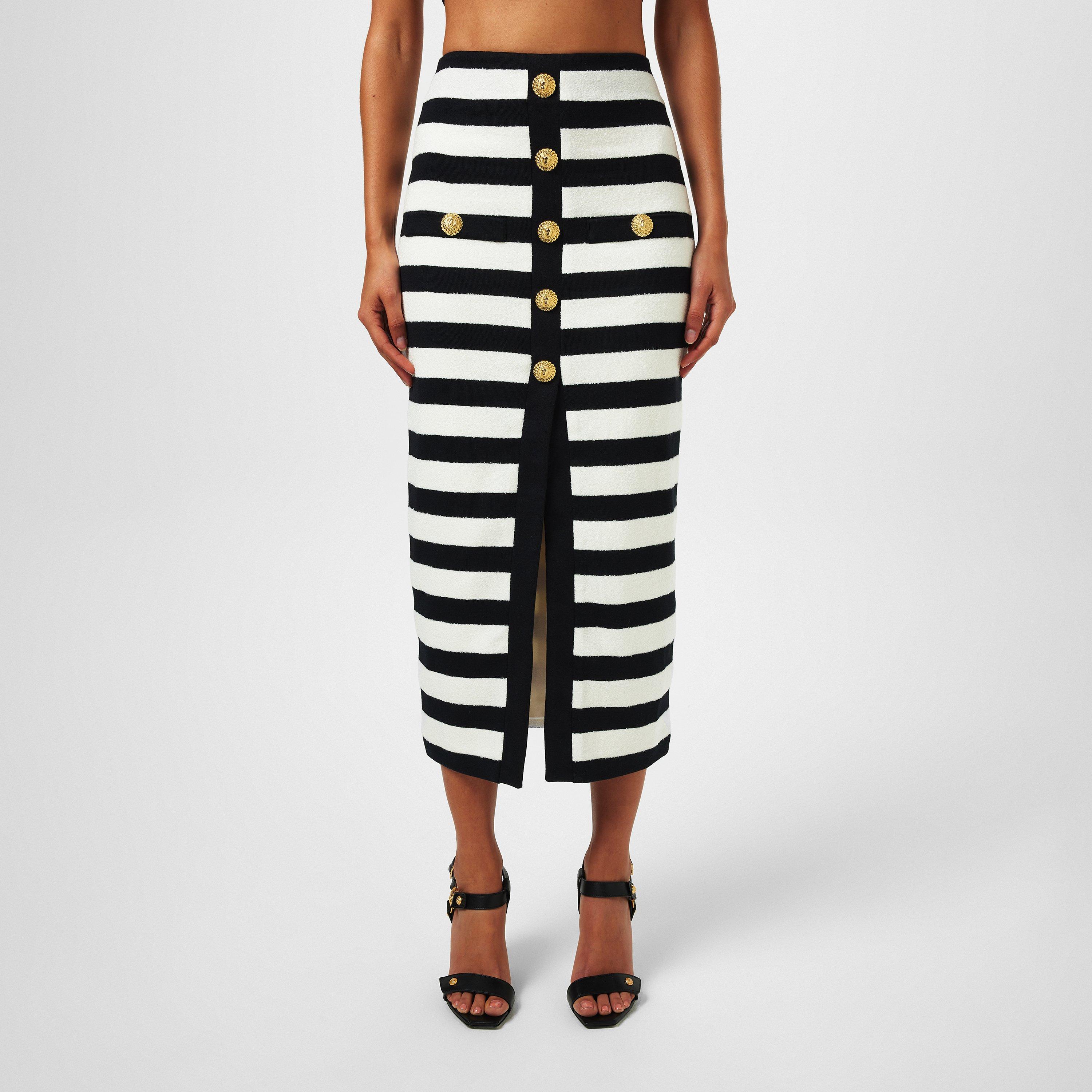 Refined yet bold, the Balmain Striped Jersey Skirt is a standout piece that fuses timeless patterning with signature designer details. This skirt features crisp black-and-white stripes and iconic gold-tone embossed buttons, offering a nod to Balmain’s luxurious aesthetic. Perfect for business lunches, gallery events, or elegant evenings out.