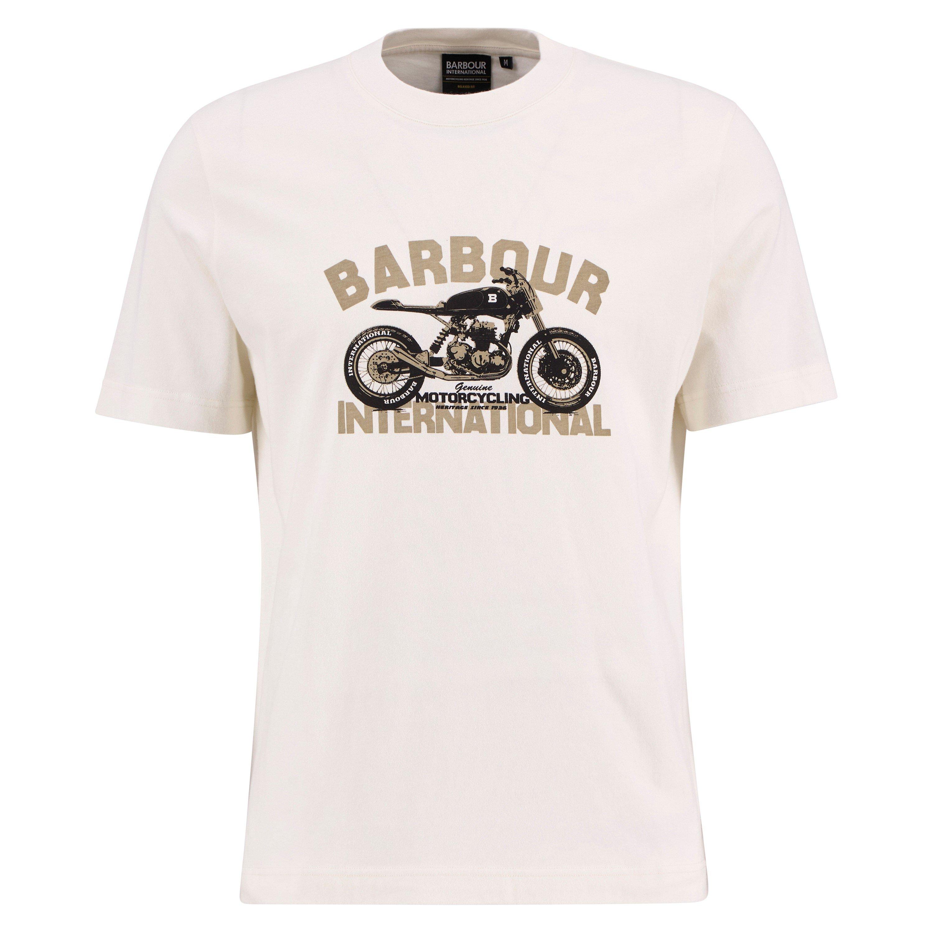 The Barbour International Shifter Graphic Print T-Shirt brings a bold edge to casual wear. Crafted from 100% cotton, this relaxed-fit tee features a striking seasonal motorcycle graphic on the chest. Designed with open cuffs and an inset rib collar, it’s a comfortable and stylish choice for everyday adventures.