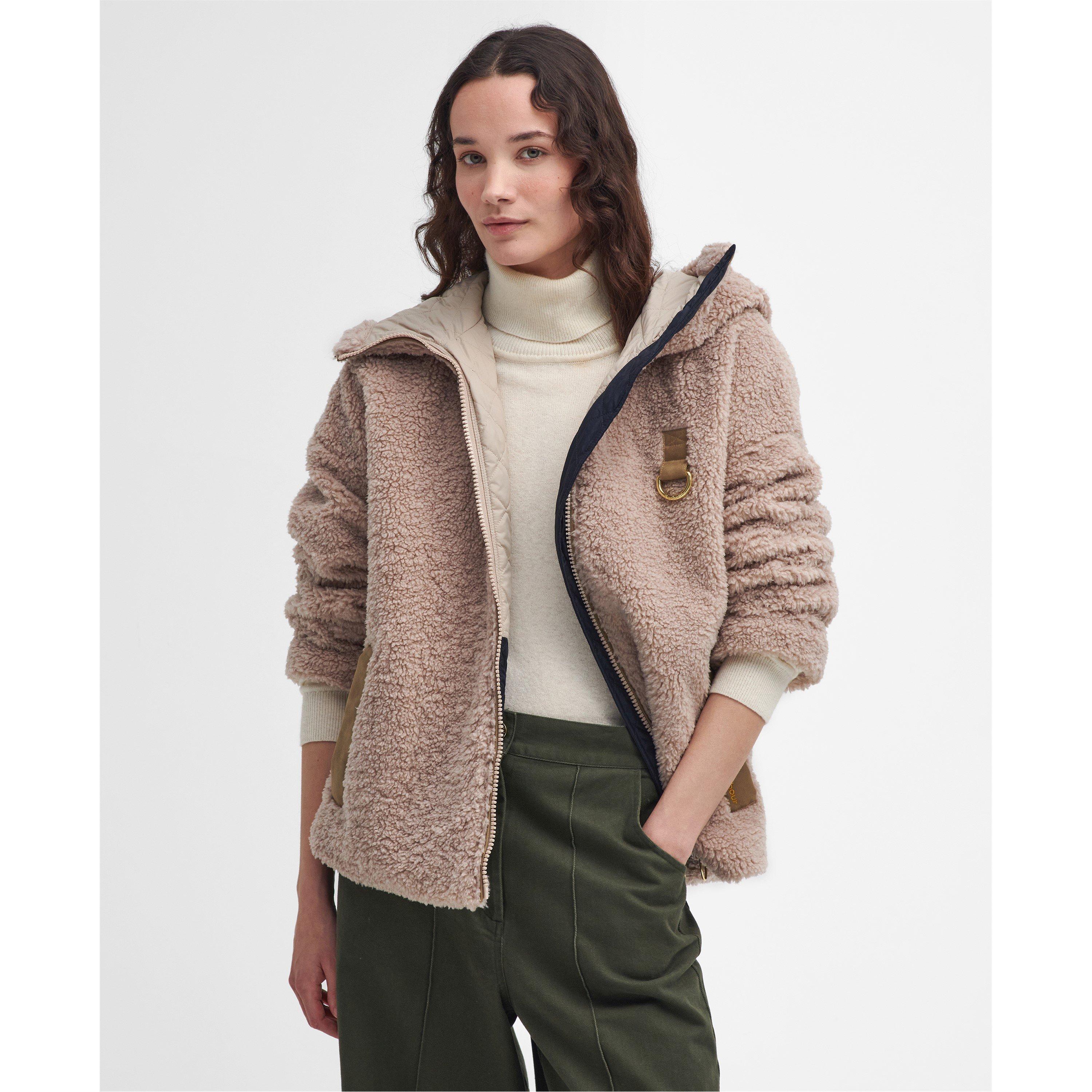 Barbour's Amber Hooded Teddy Coat delivers comfort with a luxurious plush texture. The full-zip design features practical functionality, soft fleece material, and convenient side pockets, ideal for everyday wear.