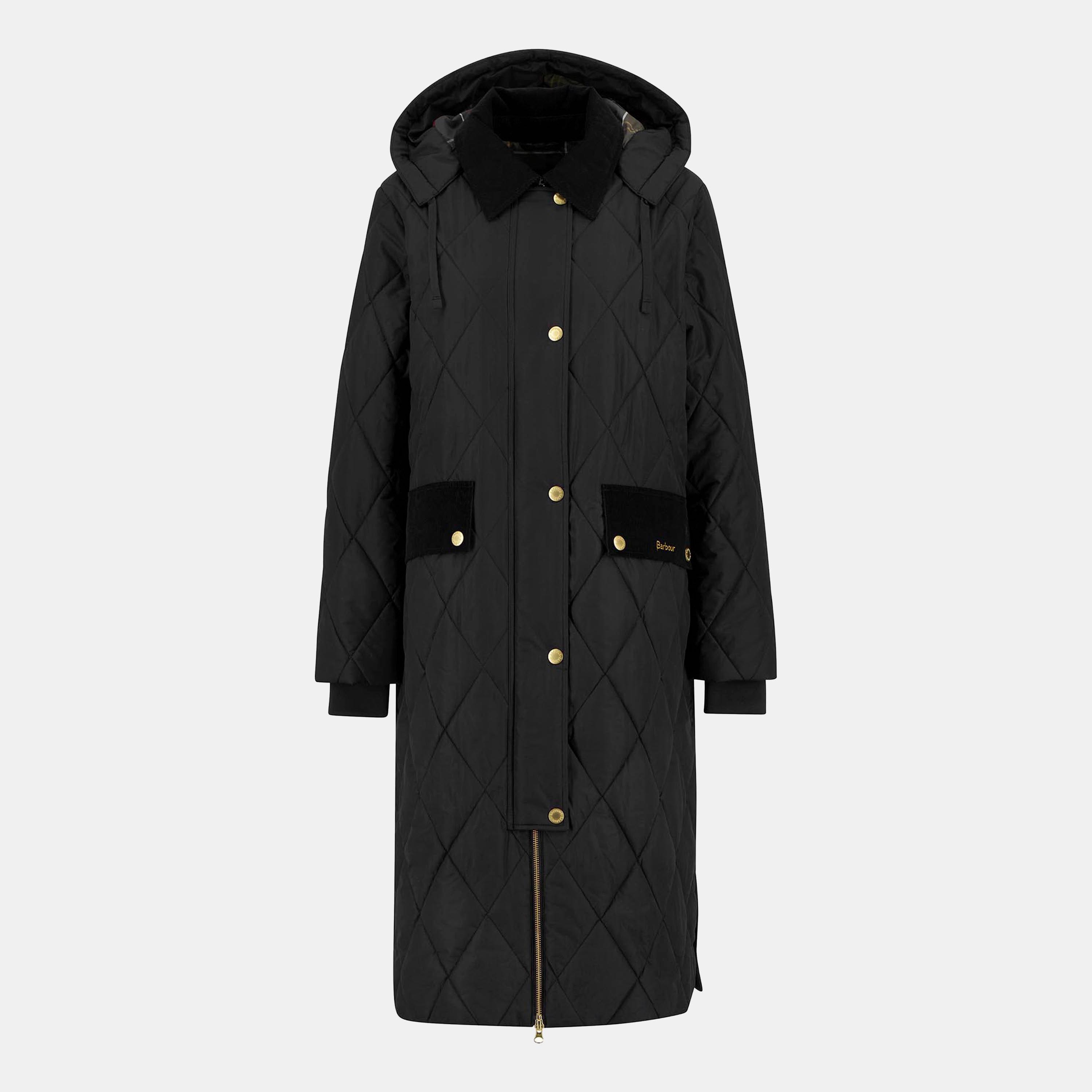 Barbour's Meredith Hooded Long Sleeve Quilted Jacket delivers warmth with four-inch diamond quilting in a longline cut. This outerwear jacket features a detachable tartan-lined hood and extended ribbed cuffs, uniting countryside heritage with contemporary urban style through its studded placket and secure zip fastening.