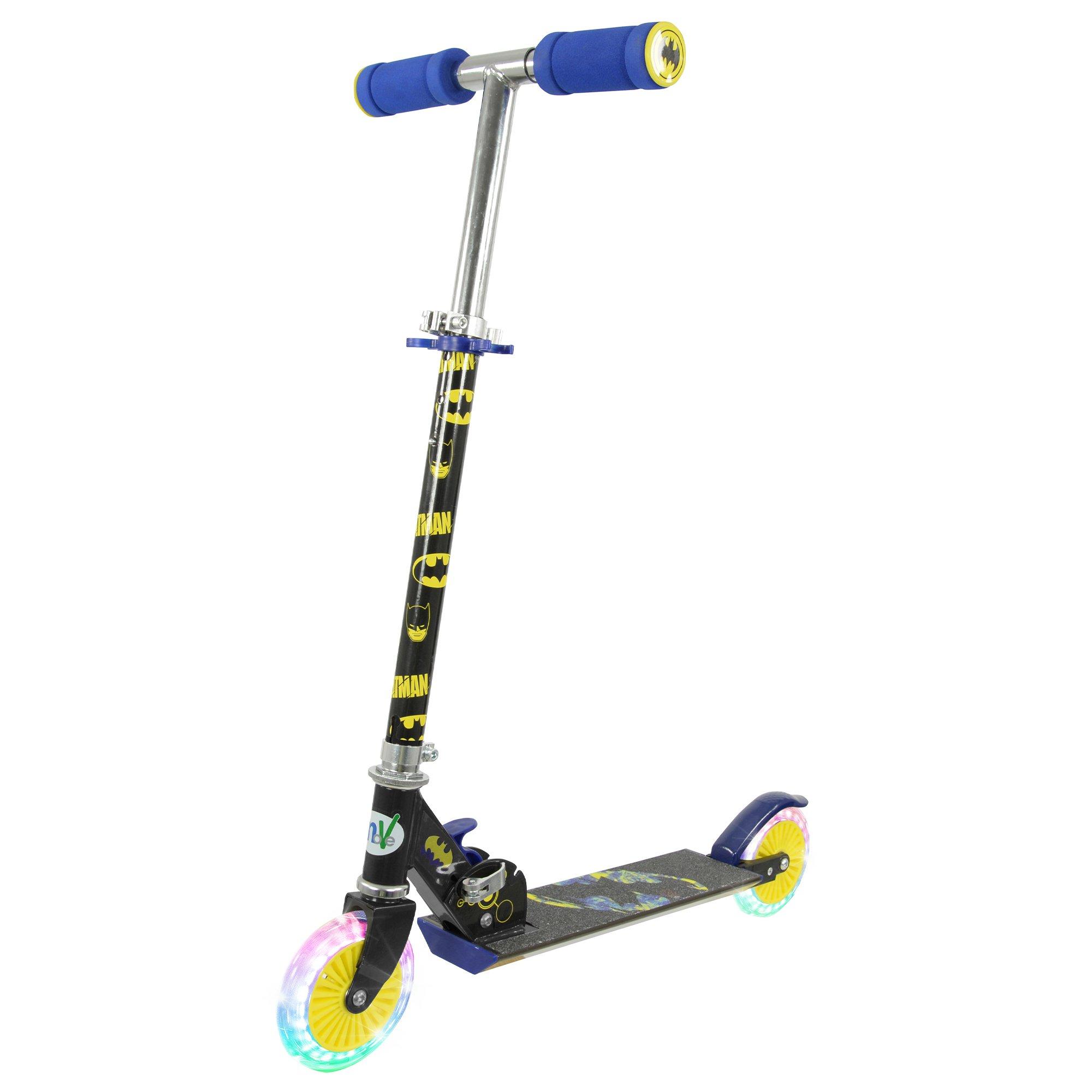 Gear up for Gotham adventures with the Batman Folding Inline Scooter with Light Up Wheels! This officially licensed scooter is the ultimate choice for young super heros. With its motion-activated light-up wheels and character graphics, you'll feel like you're patrolling the streets in style. The robust steel frame and puncture-proof tires ensure durability and confidence, while the reactive rear footbrake gives you quick and precise stopping power. Plus, with its adjustable handlebar height and quick-folding mechanism, this scooter grows with you and is easy to store or transport wherever your missions take you. Whether you're racing through the streets or cruising to school, the Batman Folding Inline Scooter with Light Up Wheels is the perfect ride. So, hit the streets with this bat-tastic scooter – because with every ride, you'll be one step closer to becoming the hero Gotham deserves!
