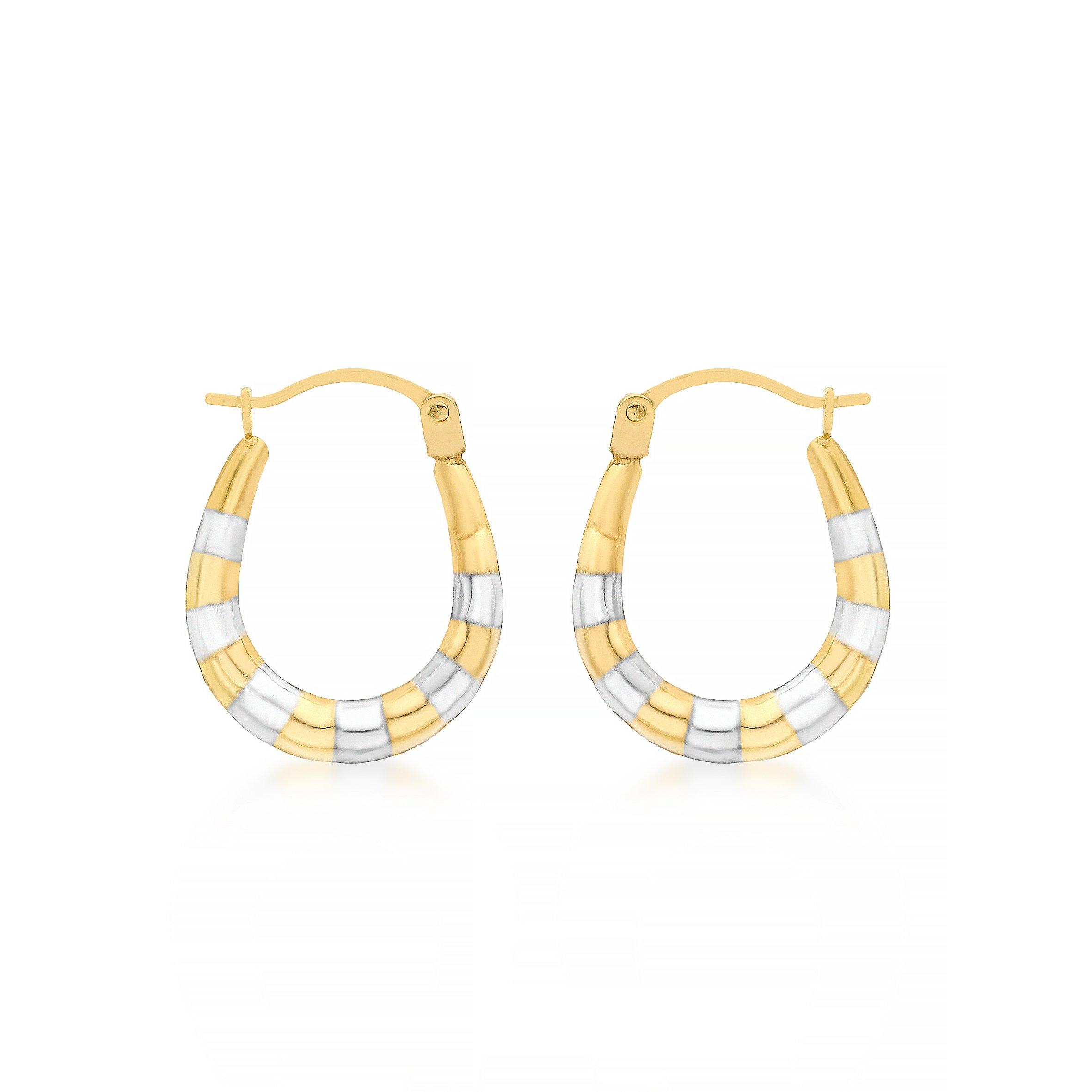 Width: 14mm Height: 17mm Gold Details: Yellow and White Gold Finish: Polished Fitting: Hinged Post Style: Creole Product Type: Earrings Metal Colour: 2 Colour Metal: 9ct Gold