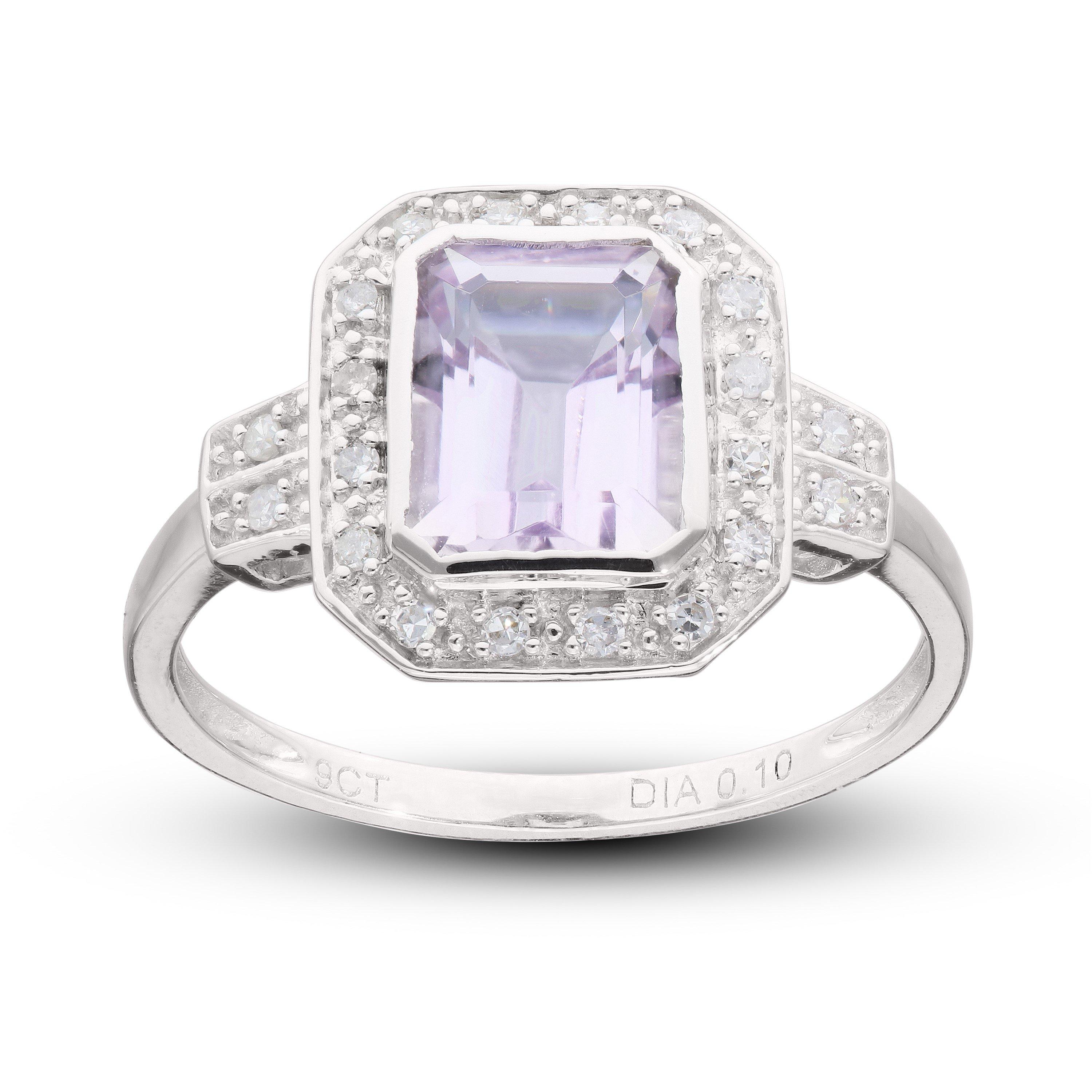 A beautiful statement ring crafted in 9ct white gold and set with an amethyst centre stone surrounded by dazzling diamonds.