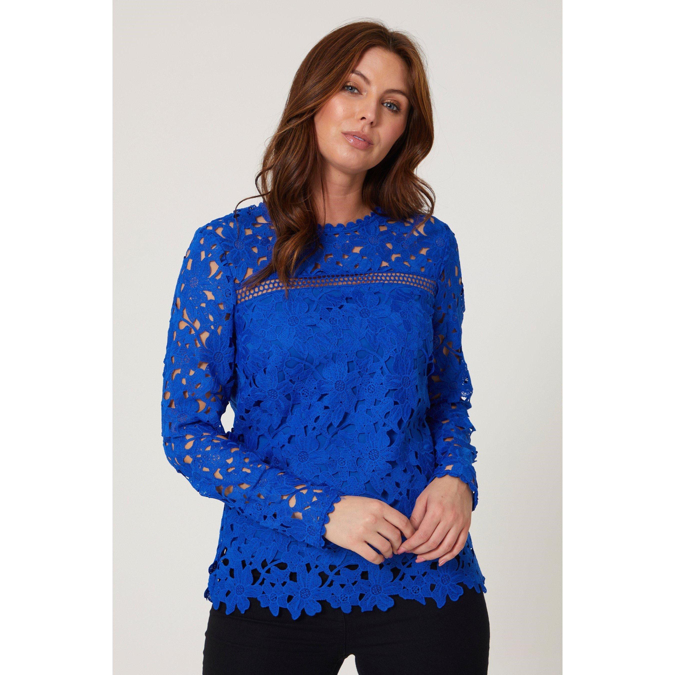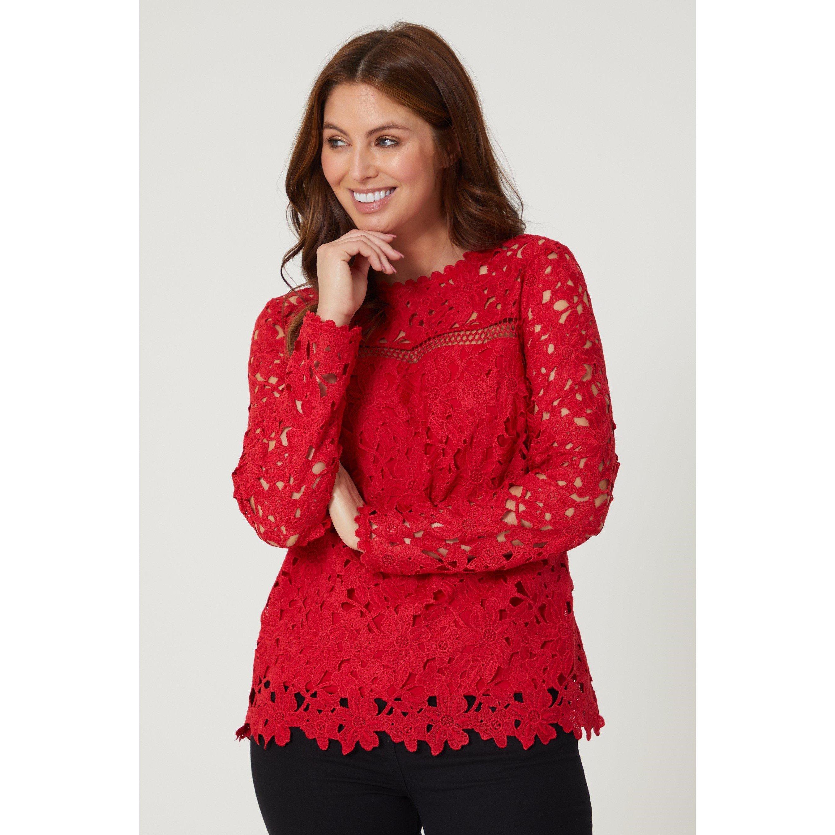 Long sleeve occasion top featuring scalloped lace and panel detail.