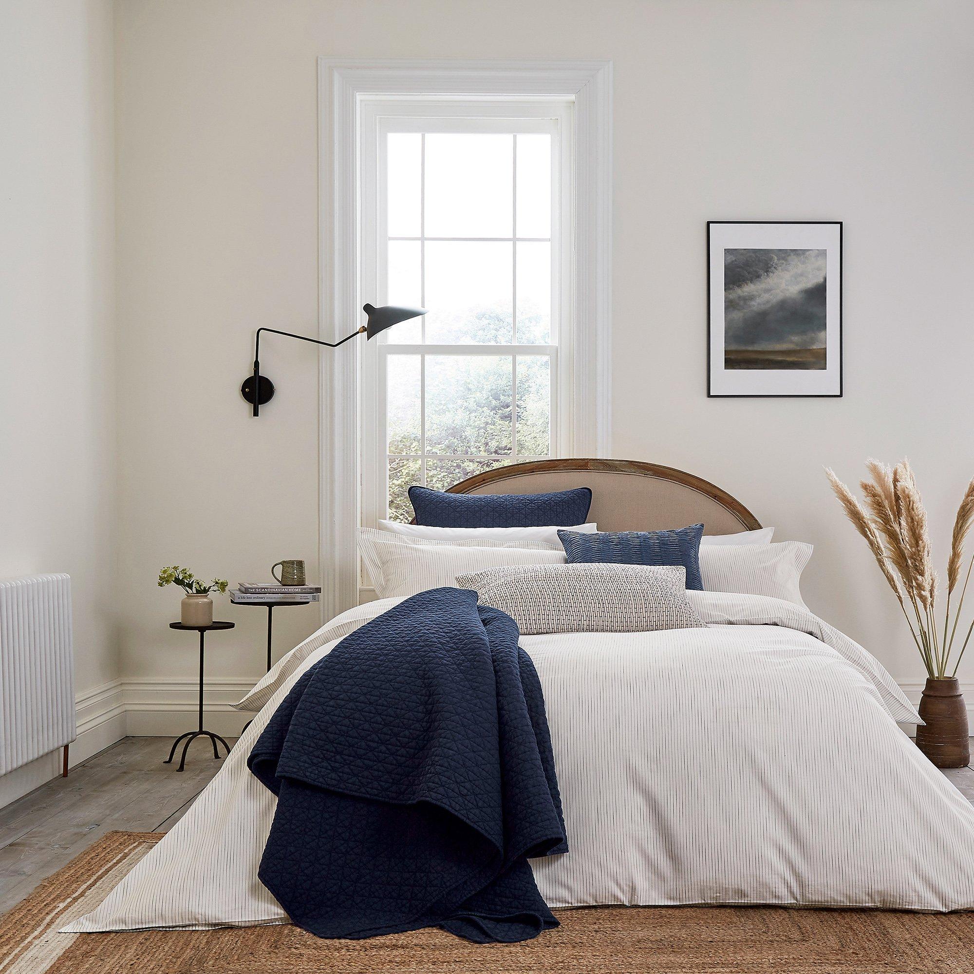 The Rare Earth collection takes it cue from the subtleties of shade found in nature. Enjoy the seasonal shift and surround yourself with nuanced textures, soothing patterns and soft colours that evoke a sense of calm and emphasize the comfort of home. Exceptionally soft to the touch, Linnea is made from a blend of BCI and recycled cotton and features a fine, irregular indigo stripe weave.