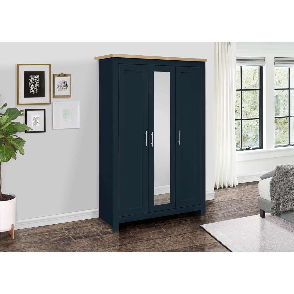 The Highgate 3 door wardrobe is spacious behind double doors, featuring a hanging rail. The doors are finished off with contemporary silver handles and a mirror.