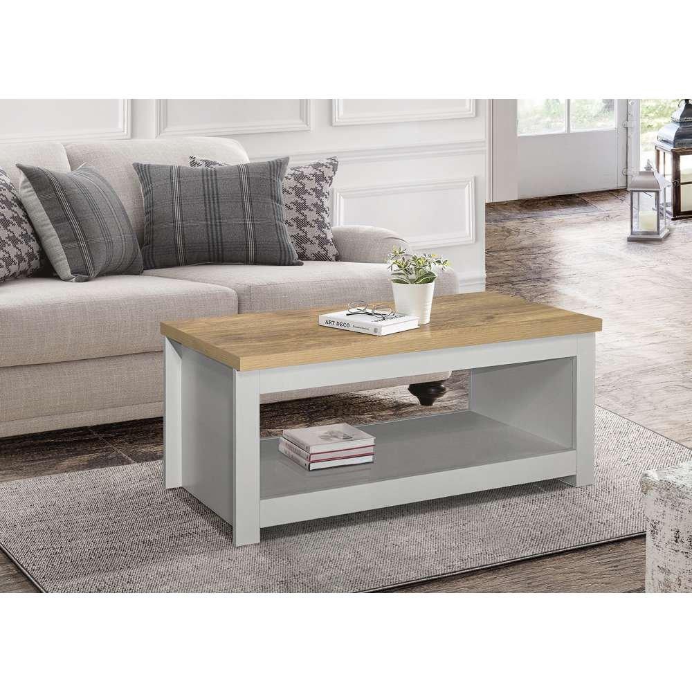 Inspired by classic farmhouse furniture the Highgate range has been designed to complement both modern and traditional homes. The Highgate range is modern, practical, affordable furniture and with stylish silver handles looks fantastic too. Available in cream & oak, grey & oak and navy & oak this range will suite a wide array of interiors. The Highgate coffee table features a large lower shelf ideal for storage. Care instructions: Wipe carefully with a soft, dry cloth.