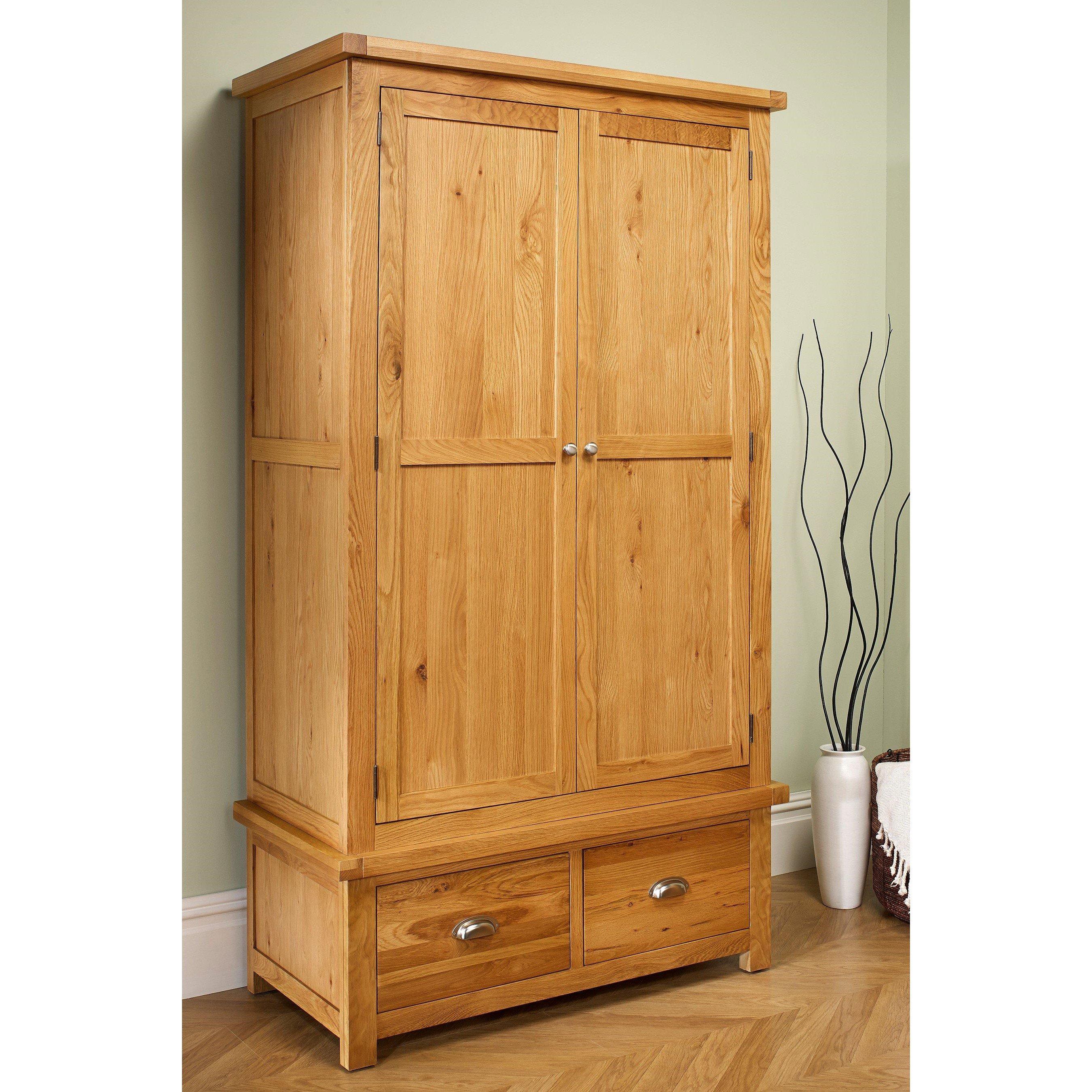 This practical wardrobe is spacious behind sturdy oak double doors, including two bottom drawers, perfect for the additional storage you need.