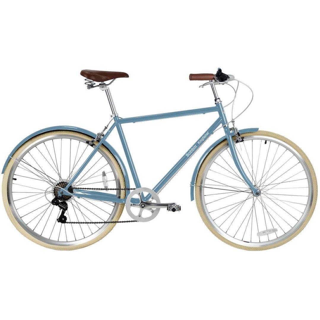 The Bobbin Kingfisher is a commuter bike that's at home in the city or on country lanes. This stylish, unisex bicycle features all the classic Bobbin touches; Immaculate gloss paint finish Wide range of colour options available Vegan leather embossed saddle Colour-matched mudguards and chaincase High strength, steel step through frame Ultra-modern “moustache” handlebars Vegan leather embossed saddle Long-lasting, Kraton handlebar grips 7 Shimano gears to get you up and down the hills Et voila: the perfect retro road bike for the urban commuter.