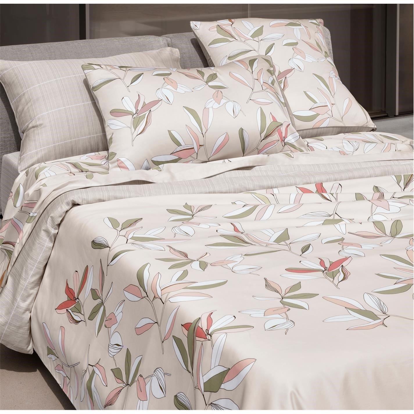 A double-sided duvet cover in a feminine powder pink hue acting as a background to spring flowers dancing in the centre of the cover. The reverse side features a tied straw motif in a contrasting but just-as-gentle green tone. Finished with button closure.