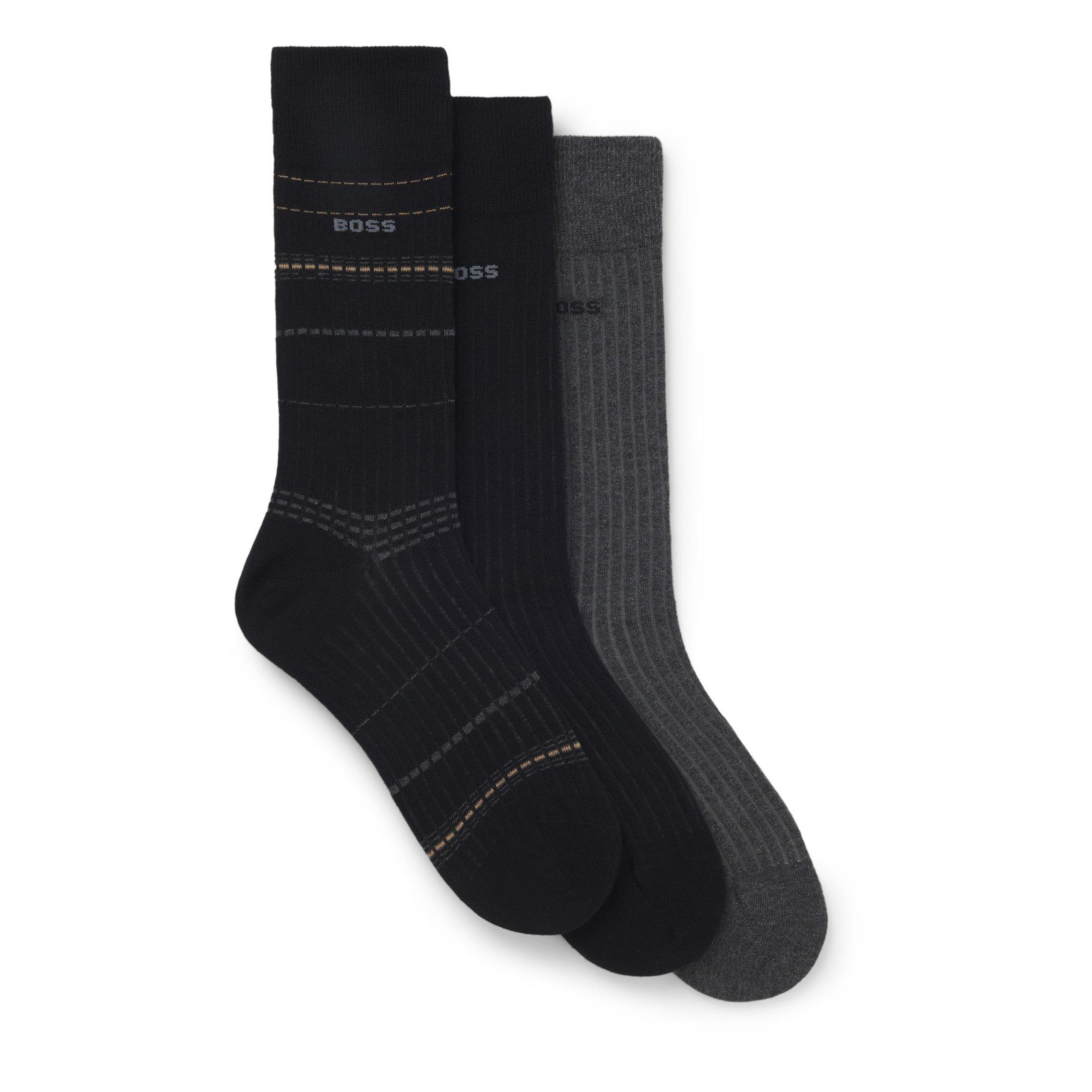 The BOSS 3 Pack Rib Stripe Socks brings everyday comfort with a touch of style. Featuring ribbed structures with logos and striped details, each pair is cut to a regular length for a classic fit. Perfect for daily wear, whether at work or on the weekend.
