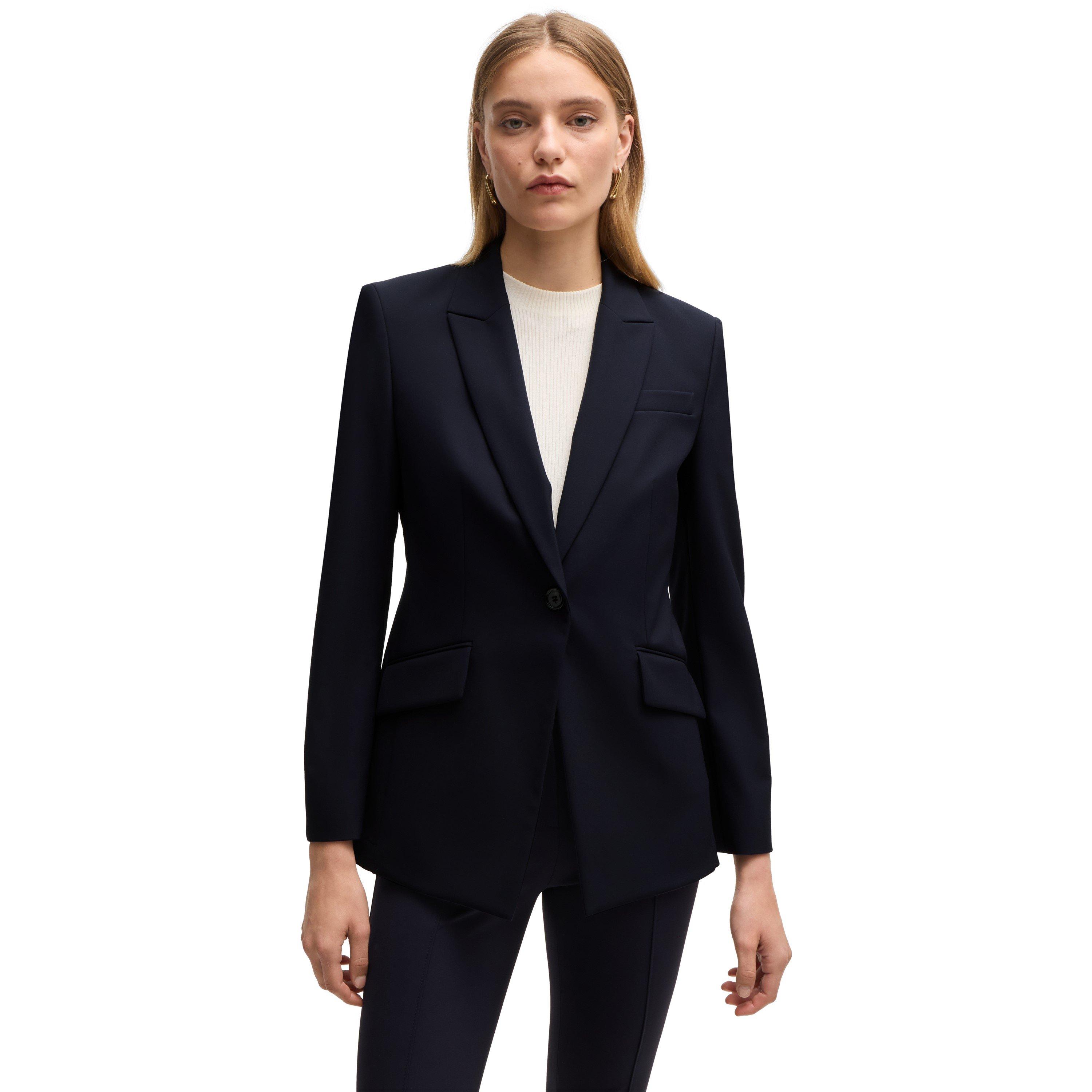 The Jabinalah Structured Blazer from BOSS delivers tailored style with clean lines. This designer outerwear piece offers a tailored shape with smart, clean appeal that complements various outfit combinations.